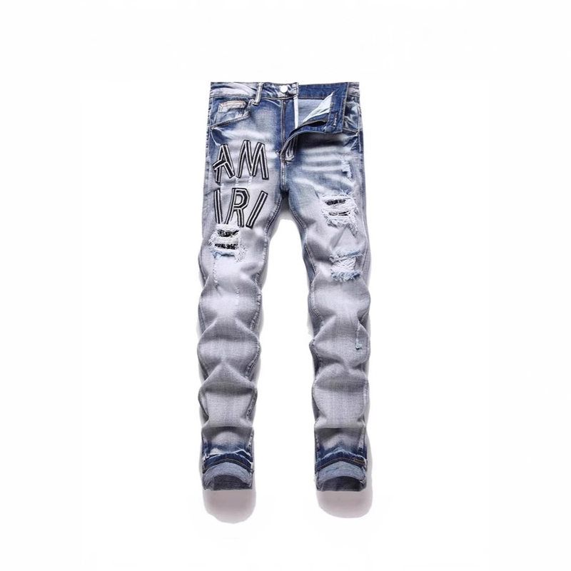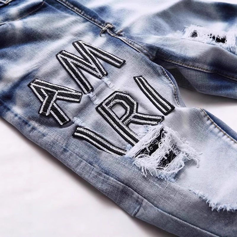 网红长裤破洞贴布刺绣潮流男潮牌补丁牛仔裤直筒小脚修身弹力个性