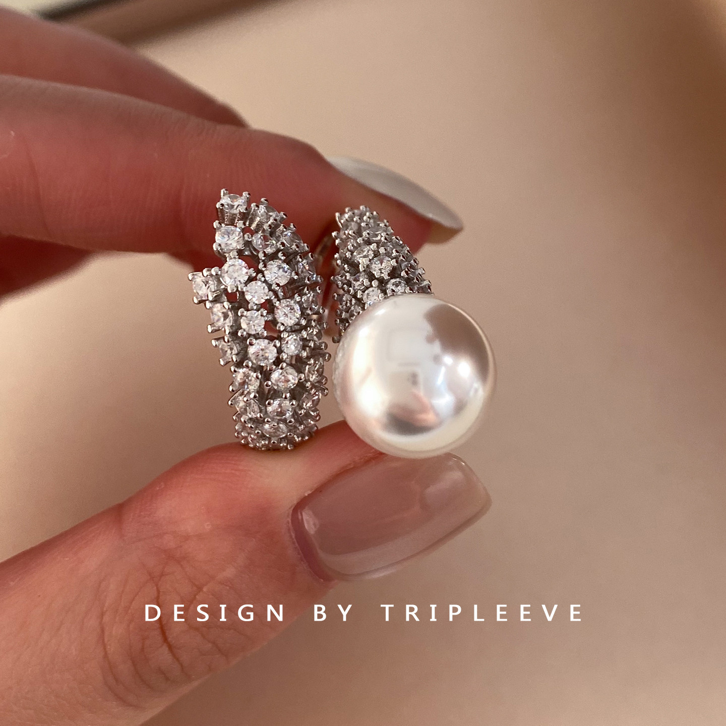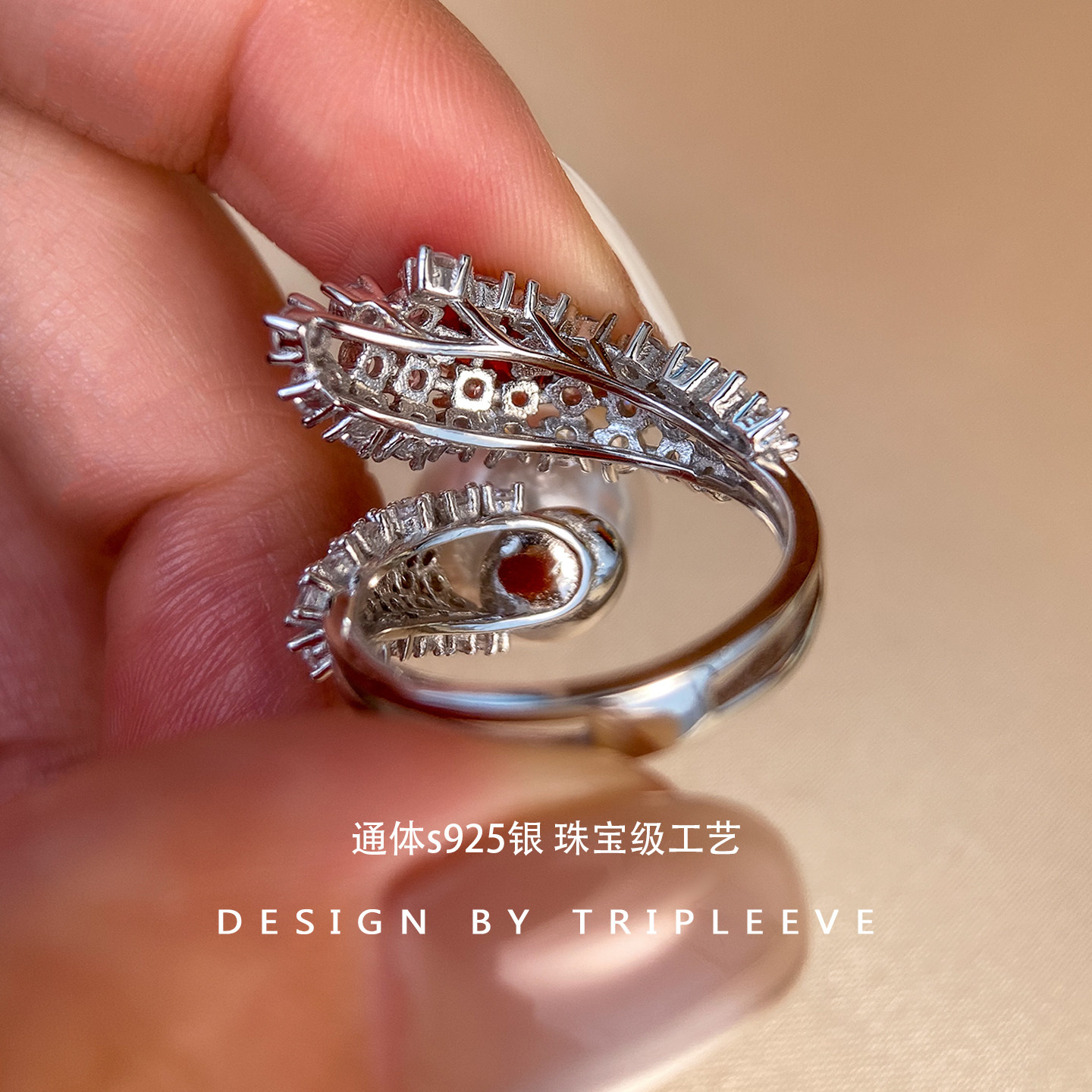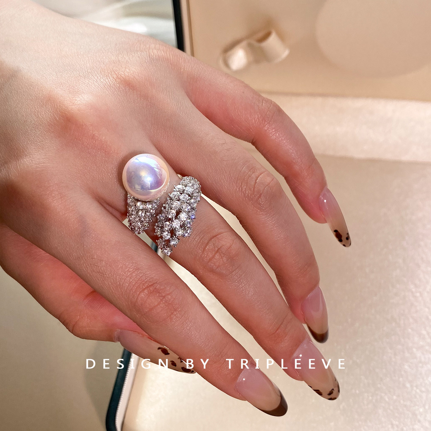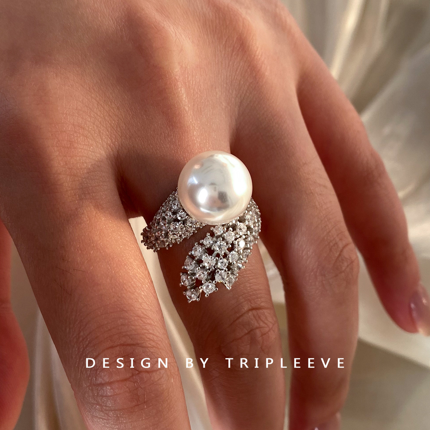 通体s925纯银彗星戒指人造澳白珍珠指环法式轻奢高级感开口戒满钻