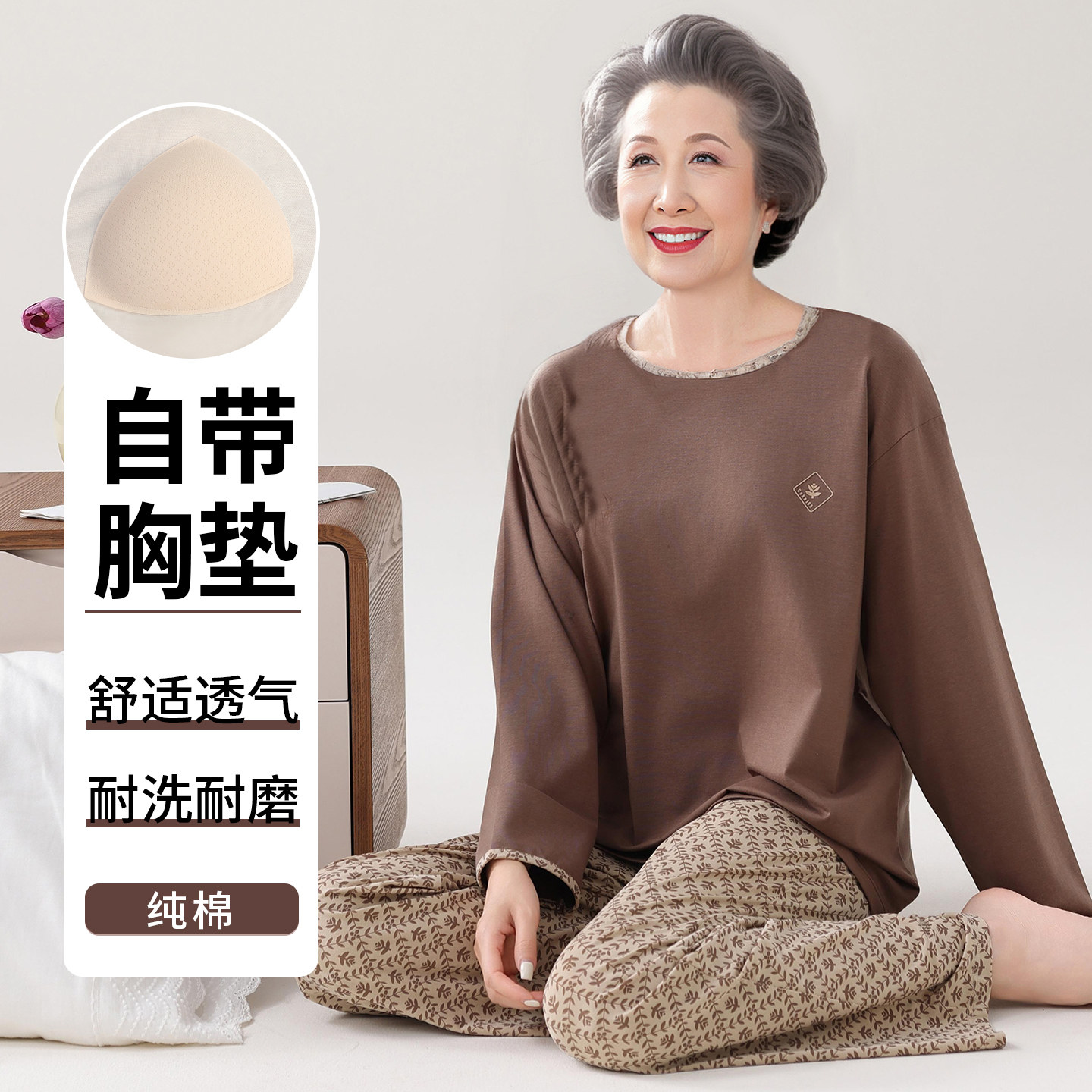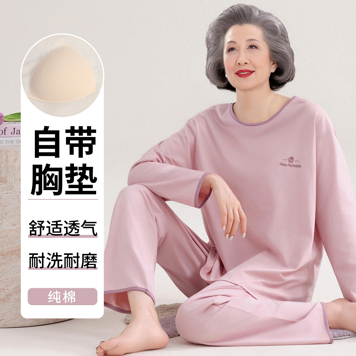 猫人带胸垫睡衣女春秋纯棉长袖中老年人妈妈婆婆大码可外穿家居服