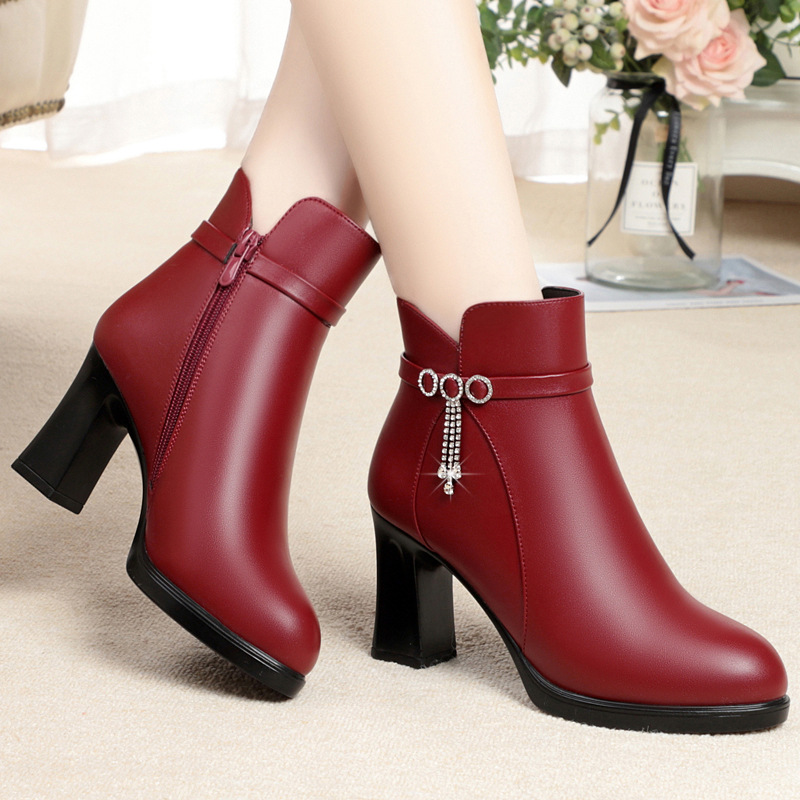 软皮短靴女中跟靴子女士新款单靴保暖透气秋冬季加绒皮鞋妈妈鞋子