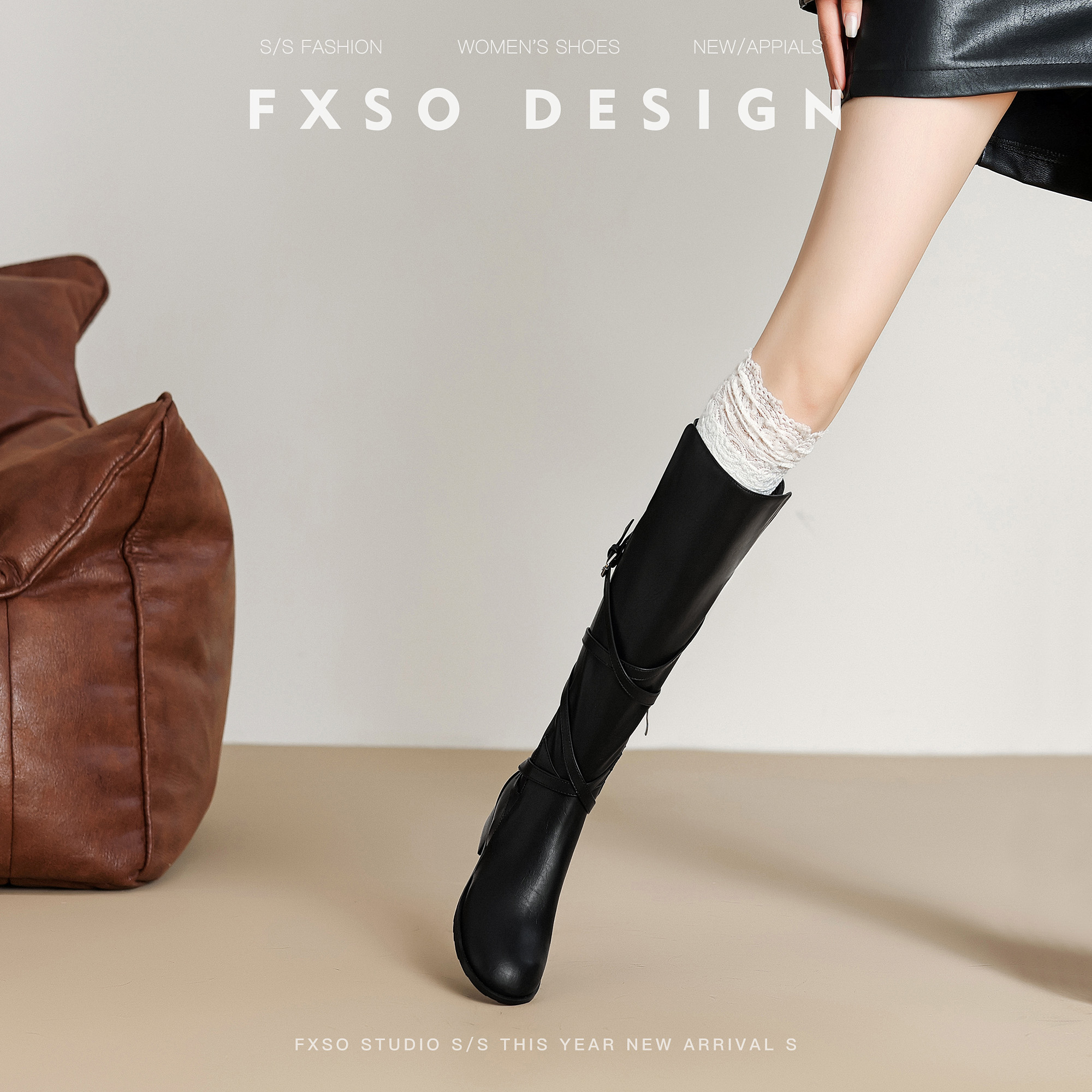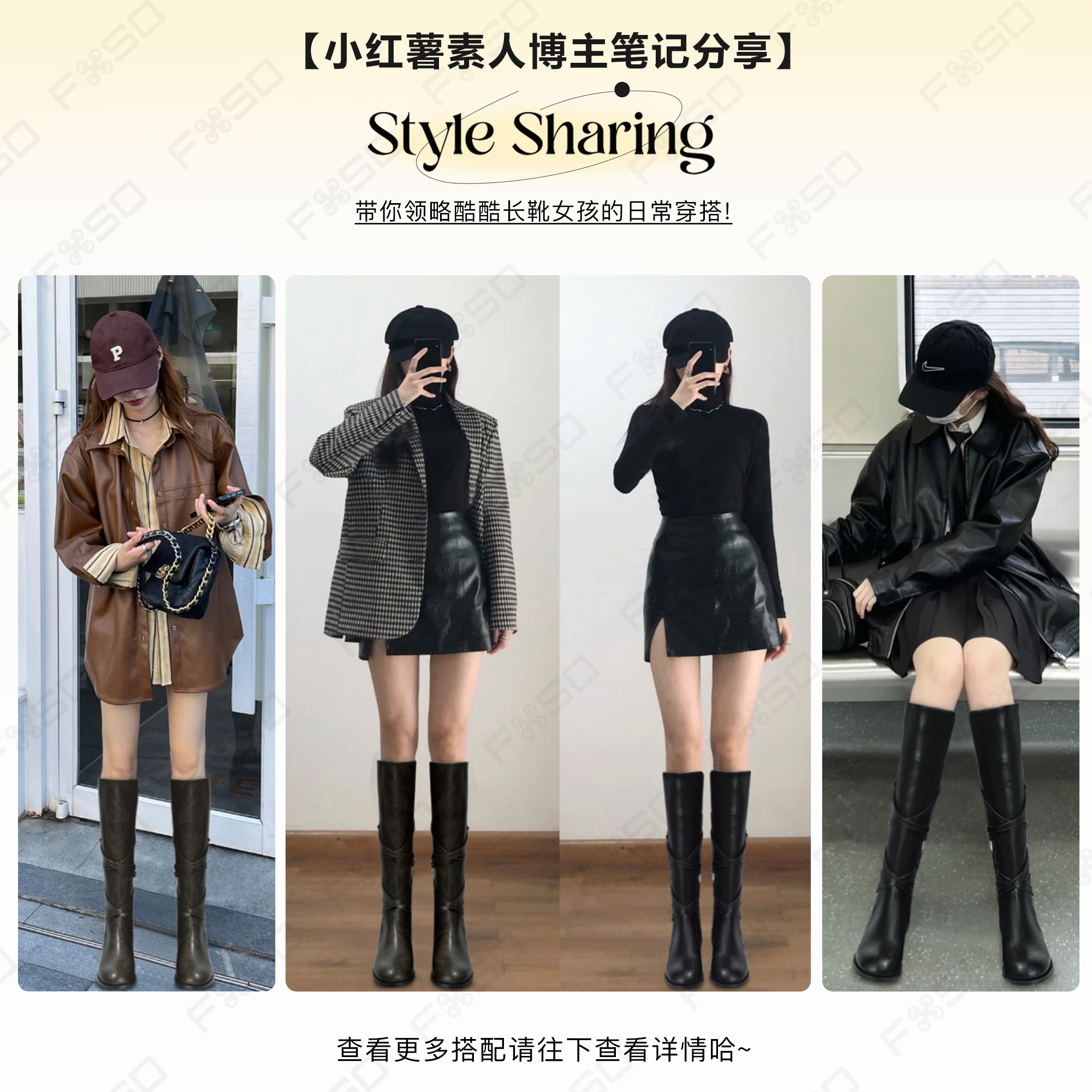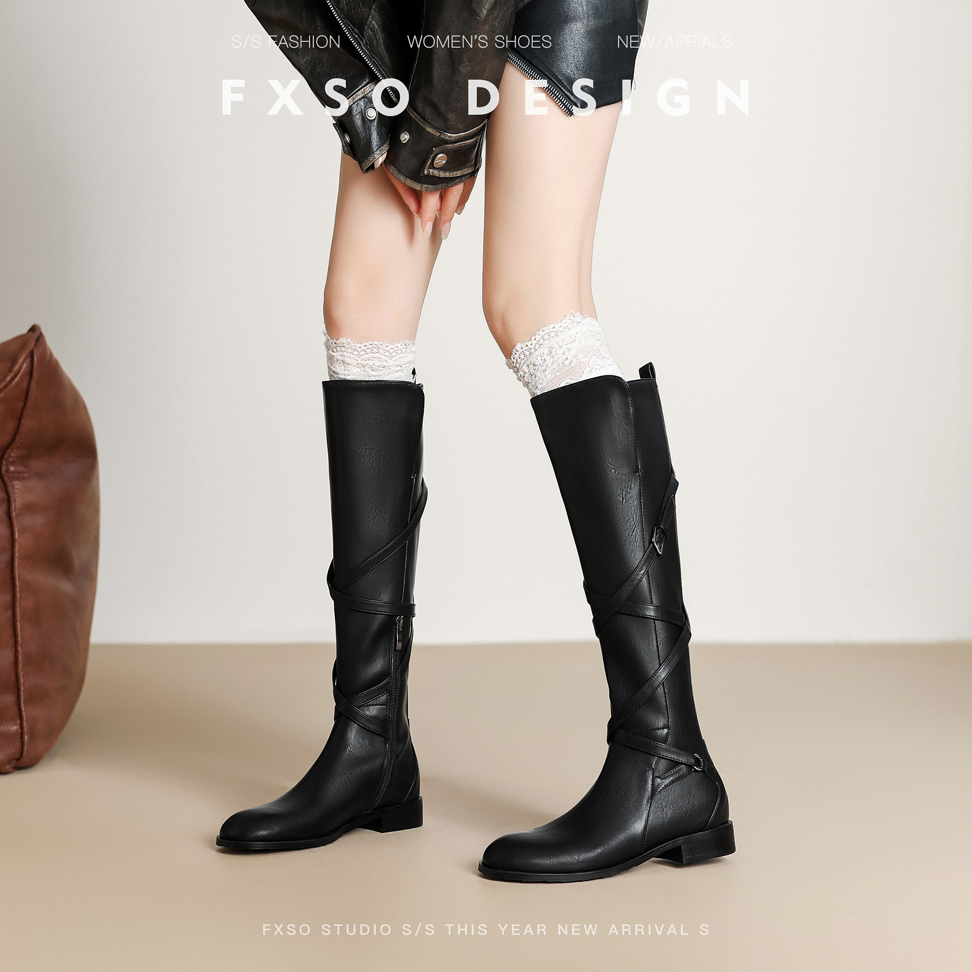 方巷大叔 真皮长靴女2025秋新款黑色靴子平底长筒靴绑带骑士靴