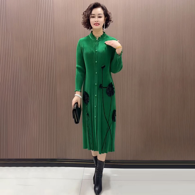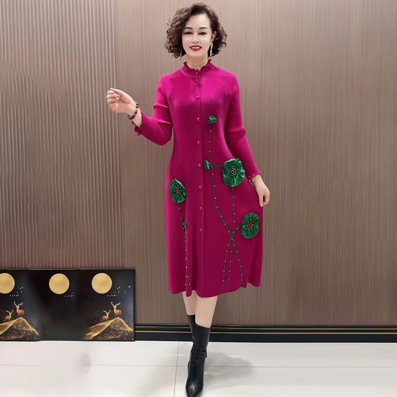 钉珠立体花开衫长袖拼色连衣裙褶皱弹力加肥时尚百搭中年妈妈长裙