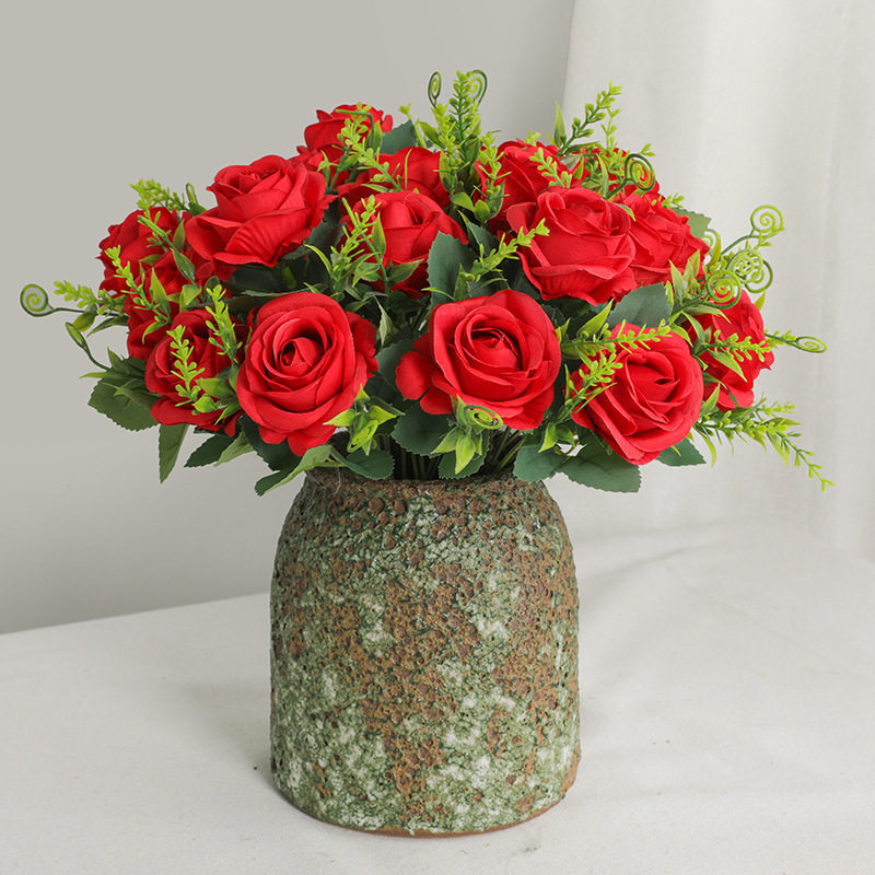 仿真花花束绢花 6头保利玫瑰花 假花客厅餐桌家居摆件红色玫瑰