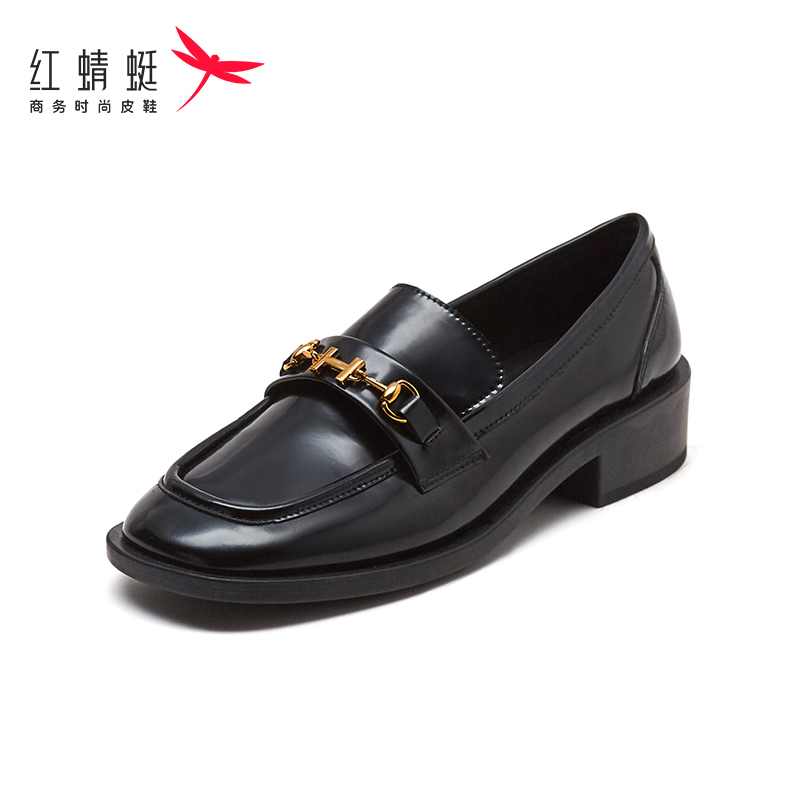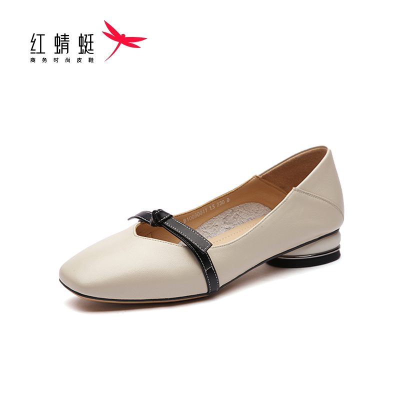 红蜻蜓春季女鞋平底方头套脚工作小皮鞋女真皮职业通勤不累脚单鞋