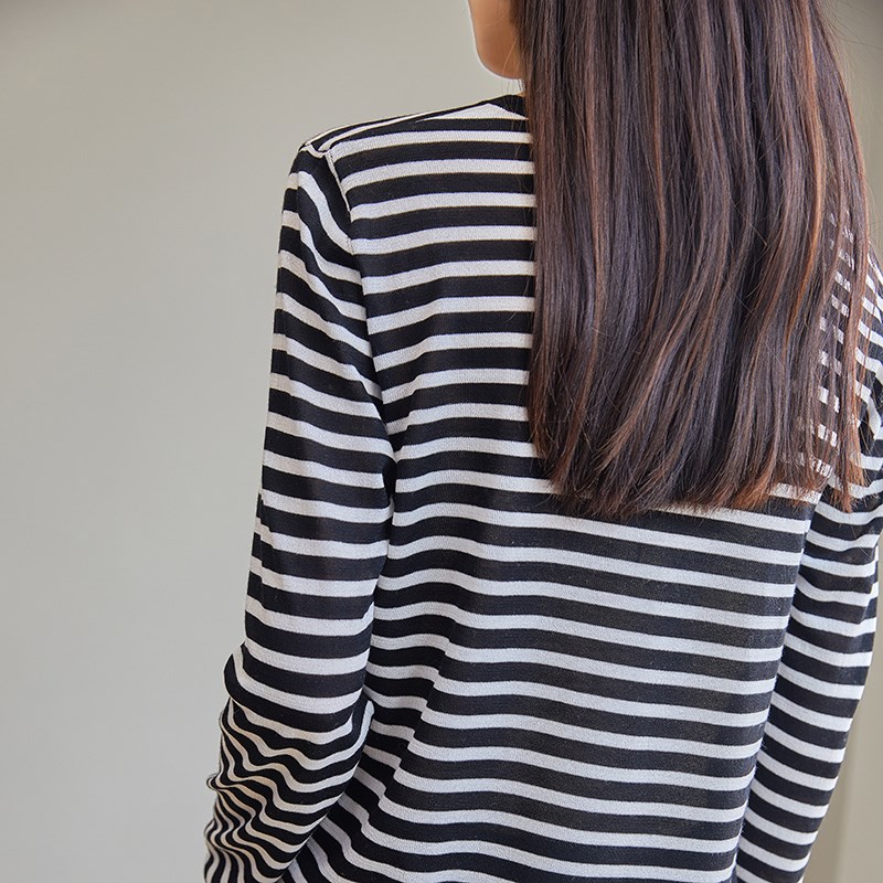 25春秋新款黑白条纹毛衣女圆领薄款套头针织衫短款宽松长袖t恤衫