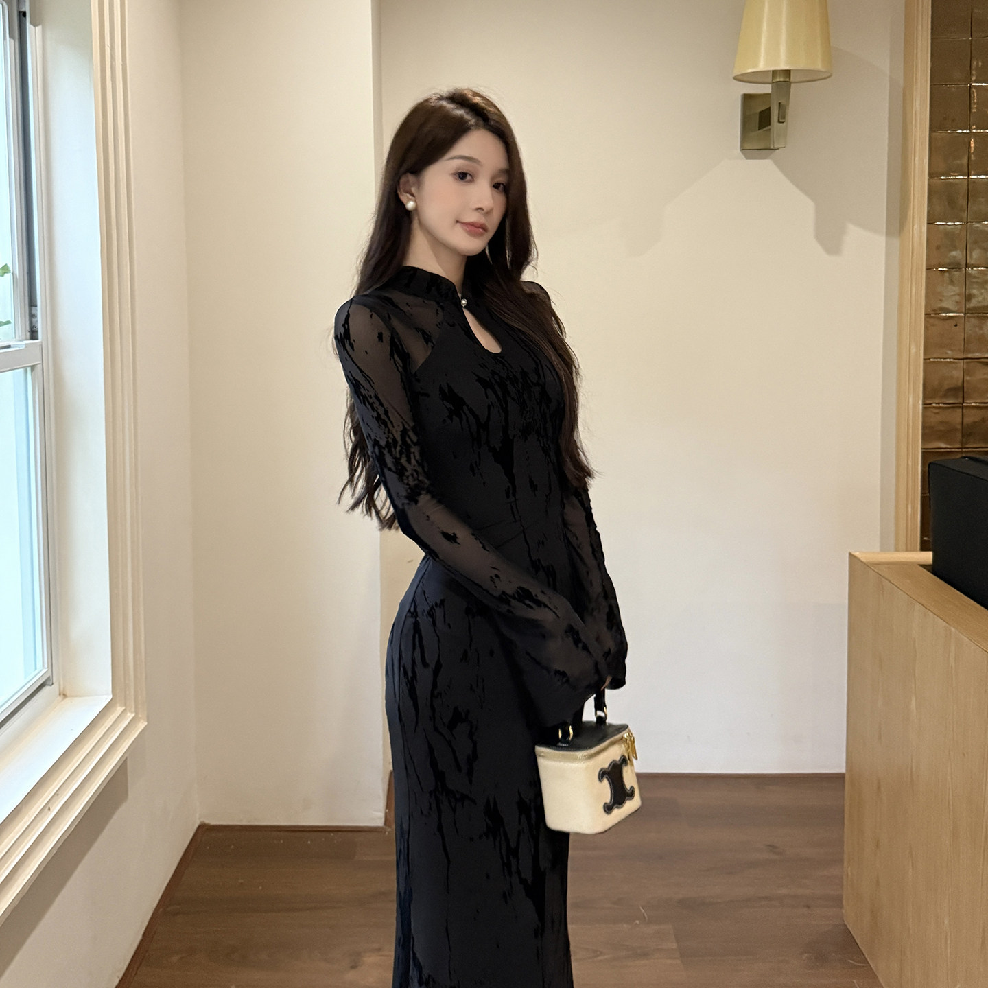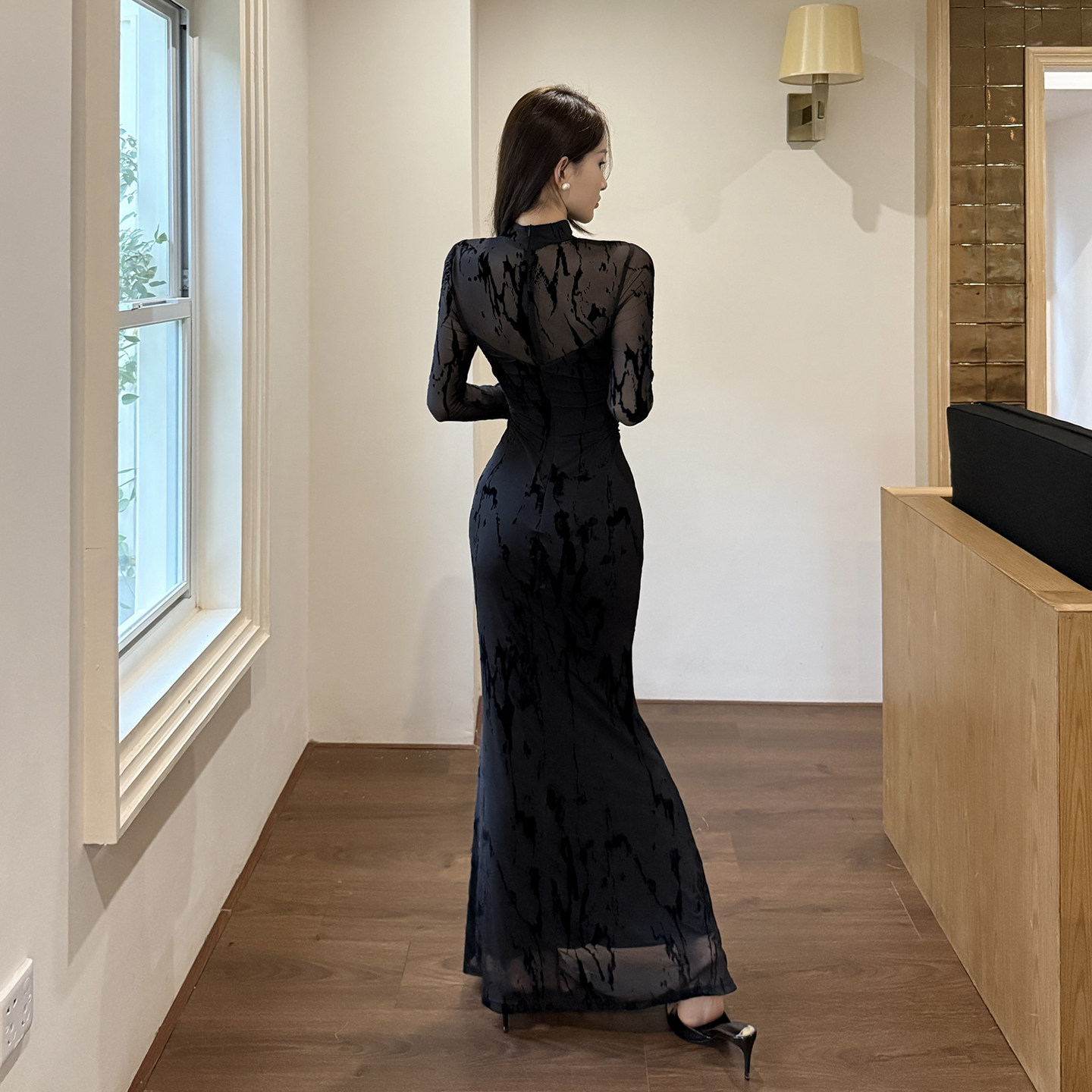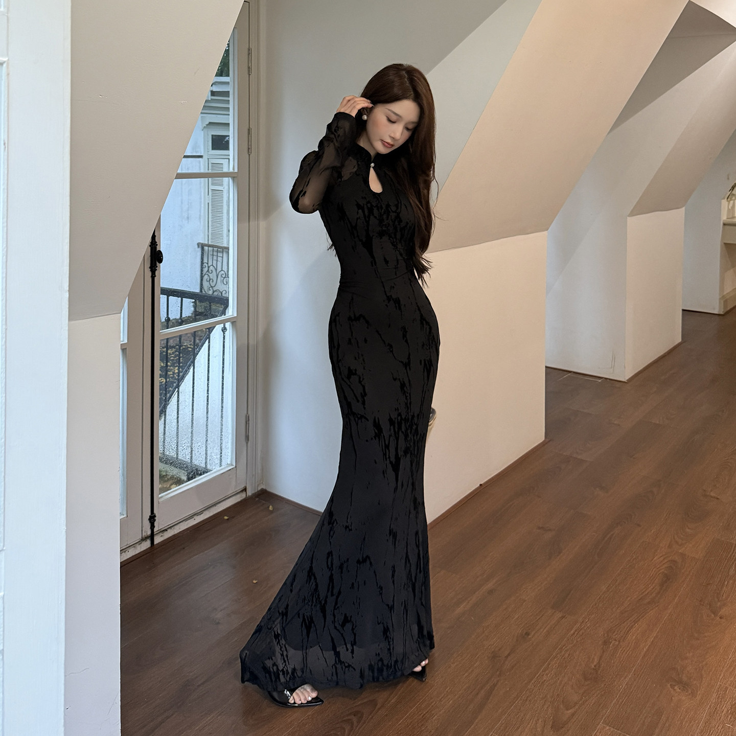 GirlsAt18 新中式改良旗袍黑色网纱连衣裙女秋季性感修身包臀长裙