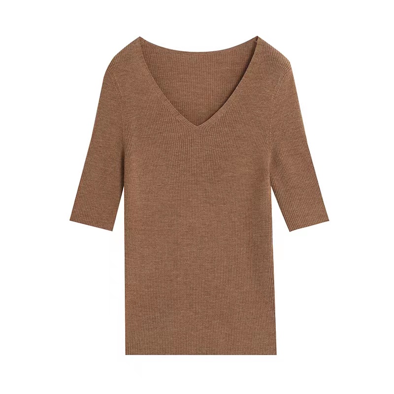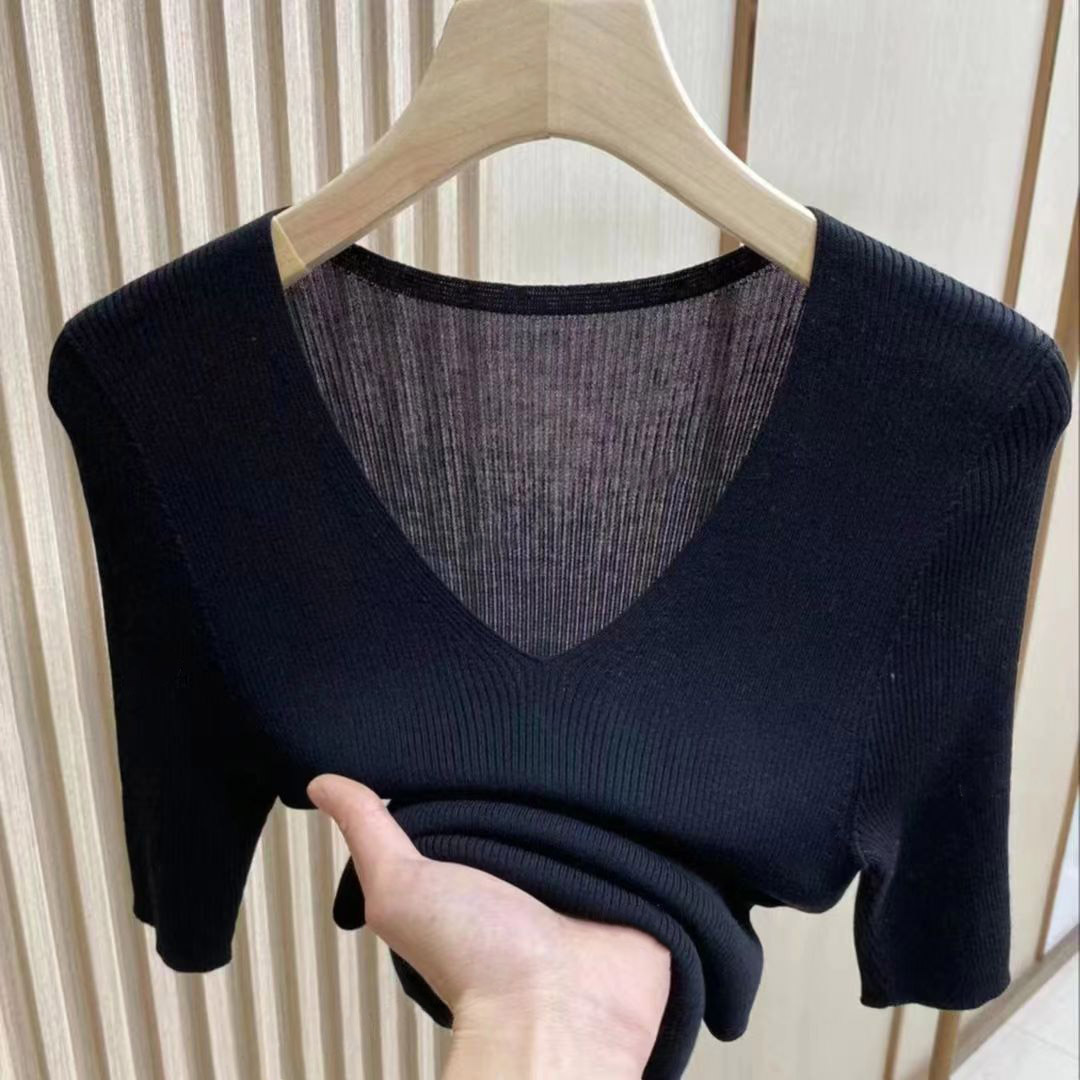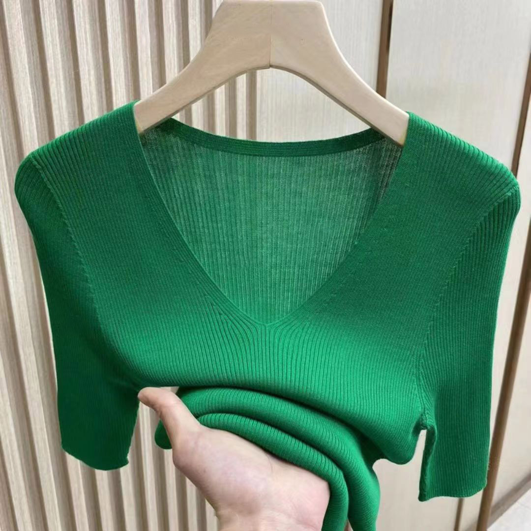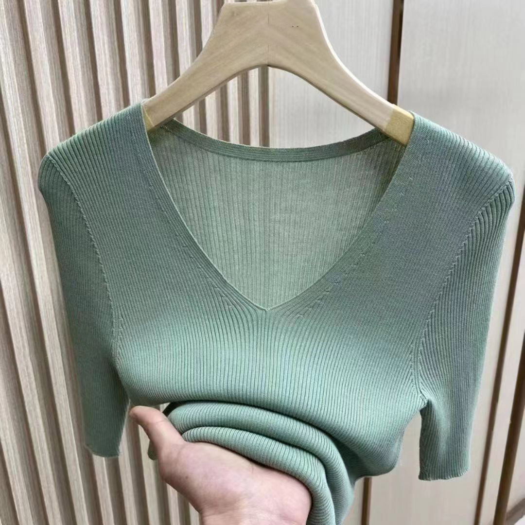 25新款高档针织短袖凉感桑蚕丝针织衫V领修身纯色百搭女夏季上衣