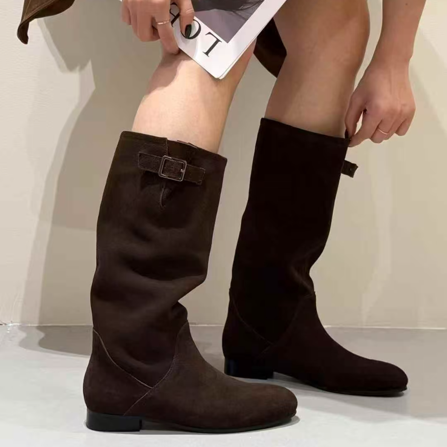 安妮欧货女鞋2025秋冬新款牛皮圆头皮带扣套筒平底百搭时尚中筒靴