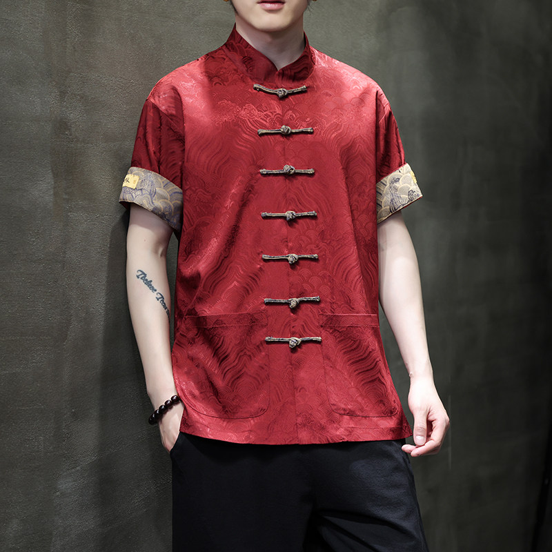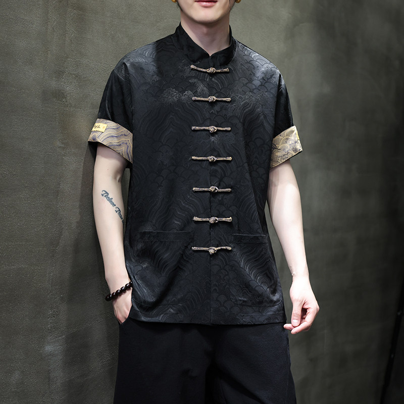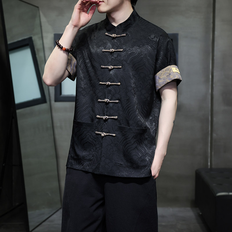 冰丝短袖衬衫男高级感提花盘扣上衣夏季新中式男装中国风唐装汉服