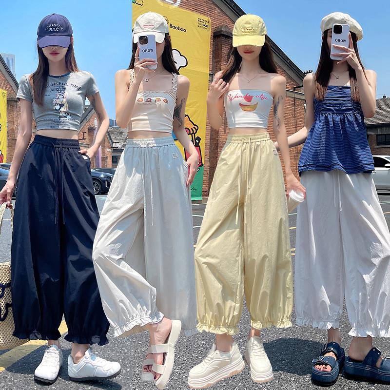 藏青色冰丝木耳边灯笼裤女夏季九分气球裤小个子速干阔腿裤哈伦裤