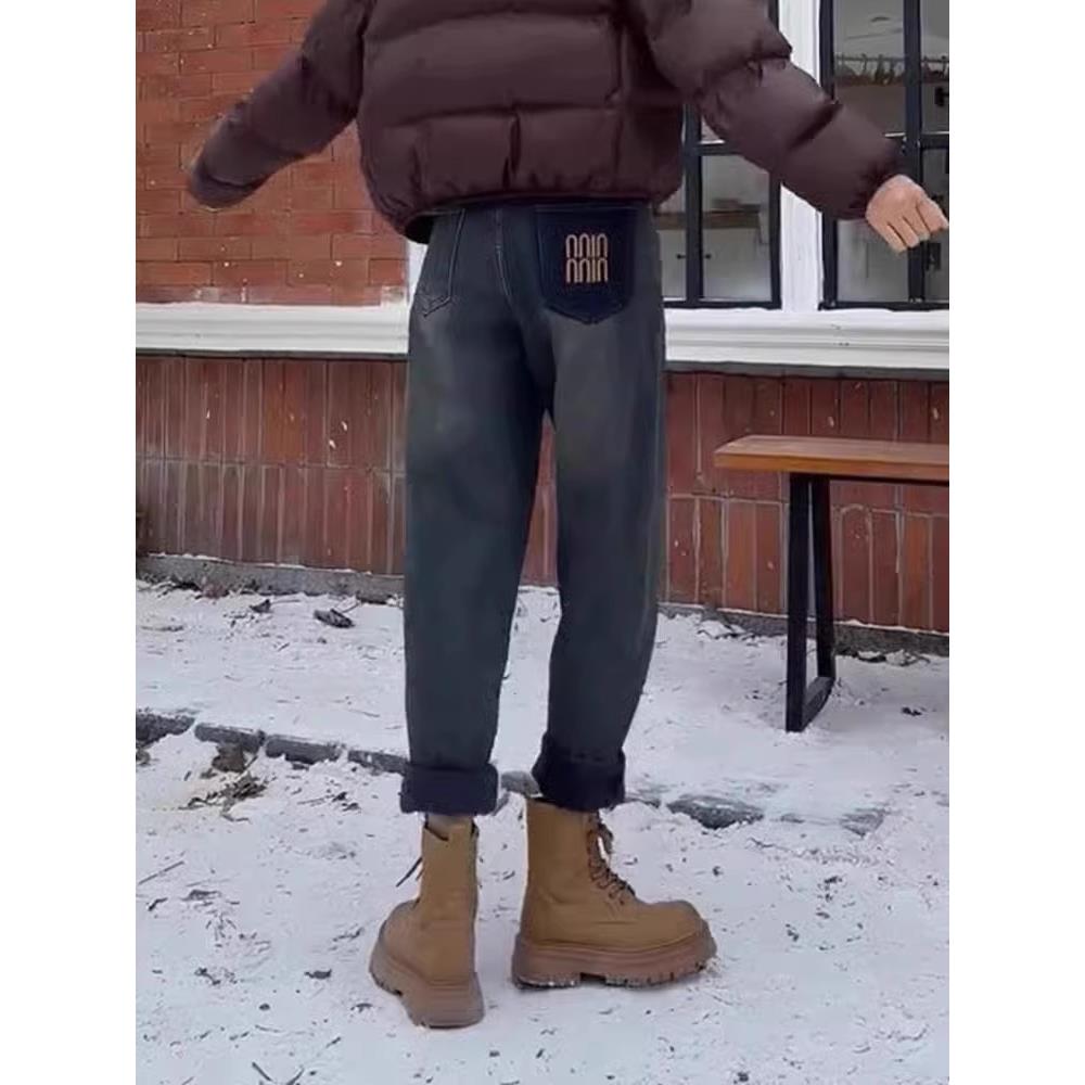 加绒加厚哈伦牛仔裤女2025年冬季新款大码胖mm高腰弹力显瘦老爹裤