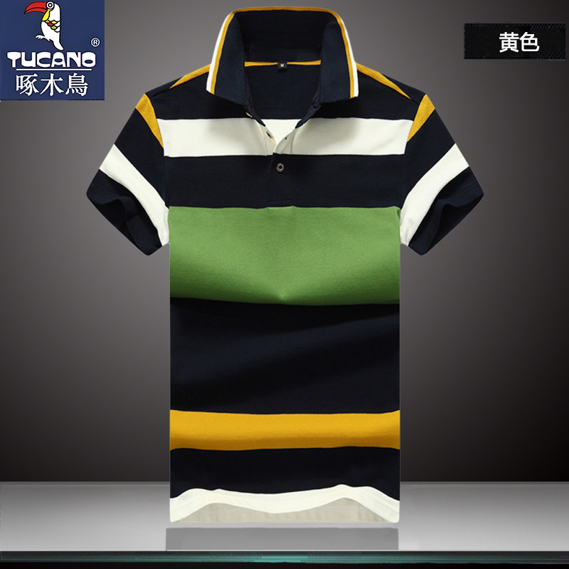 啄木鸟男士短袖t恤翻领条纹polo衫纯棉t恤2025新款有领衬衫领衣服