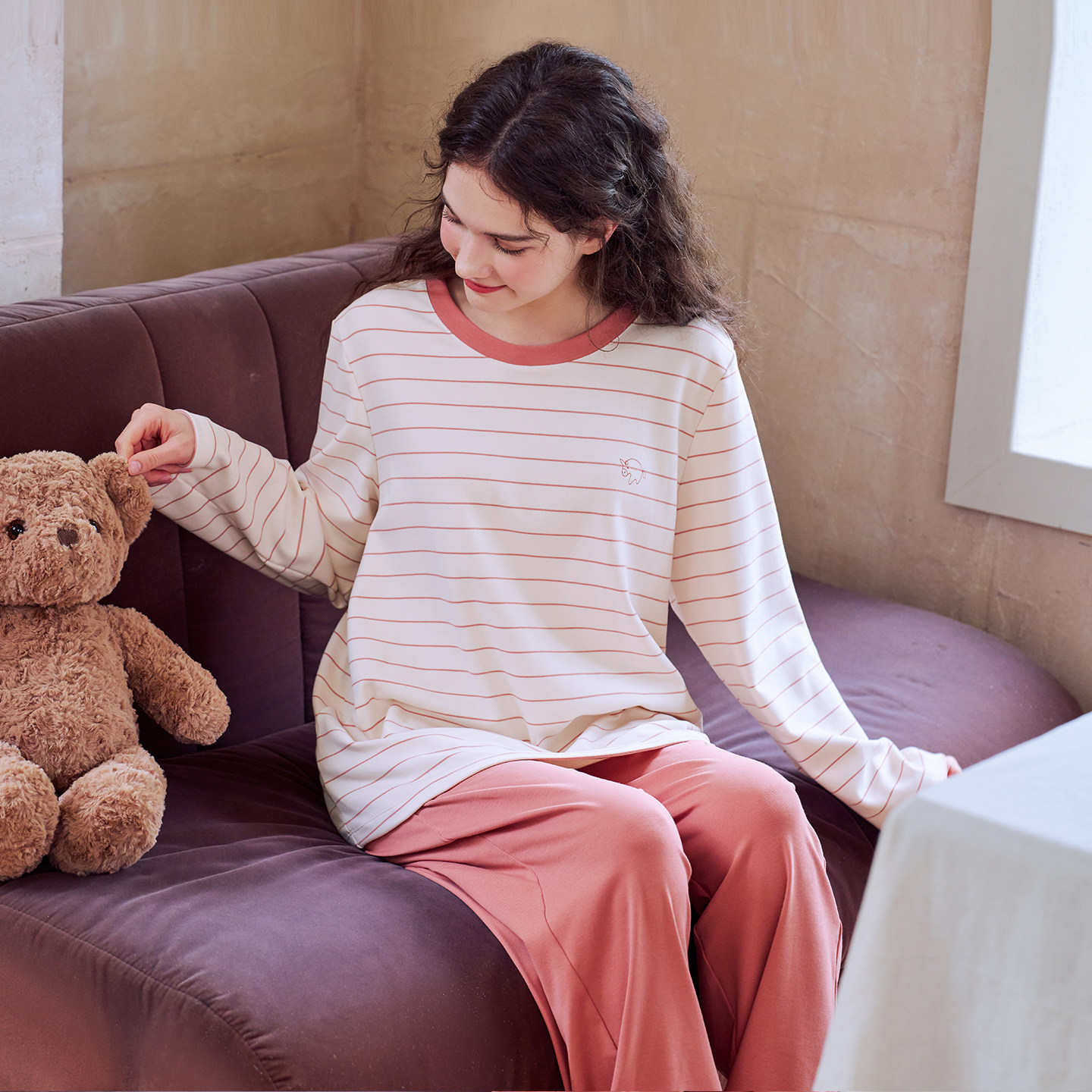 美标2025新款长袖纯棉睡衣套装女秋冬休闲简约条纹柔软全棉家居服