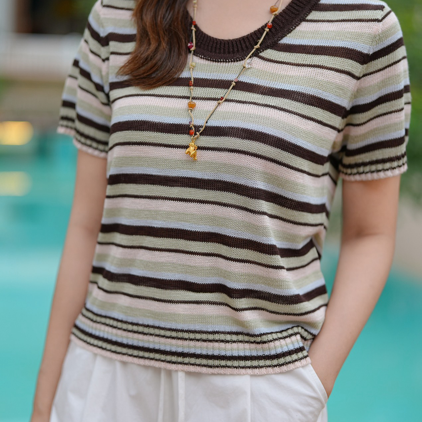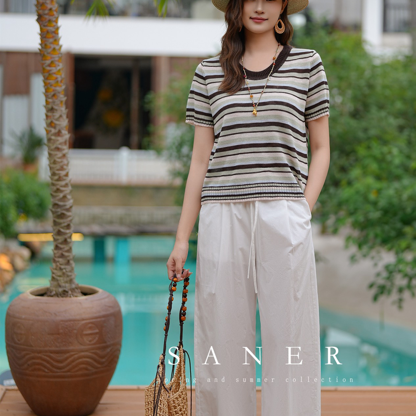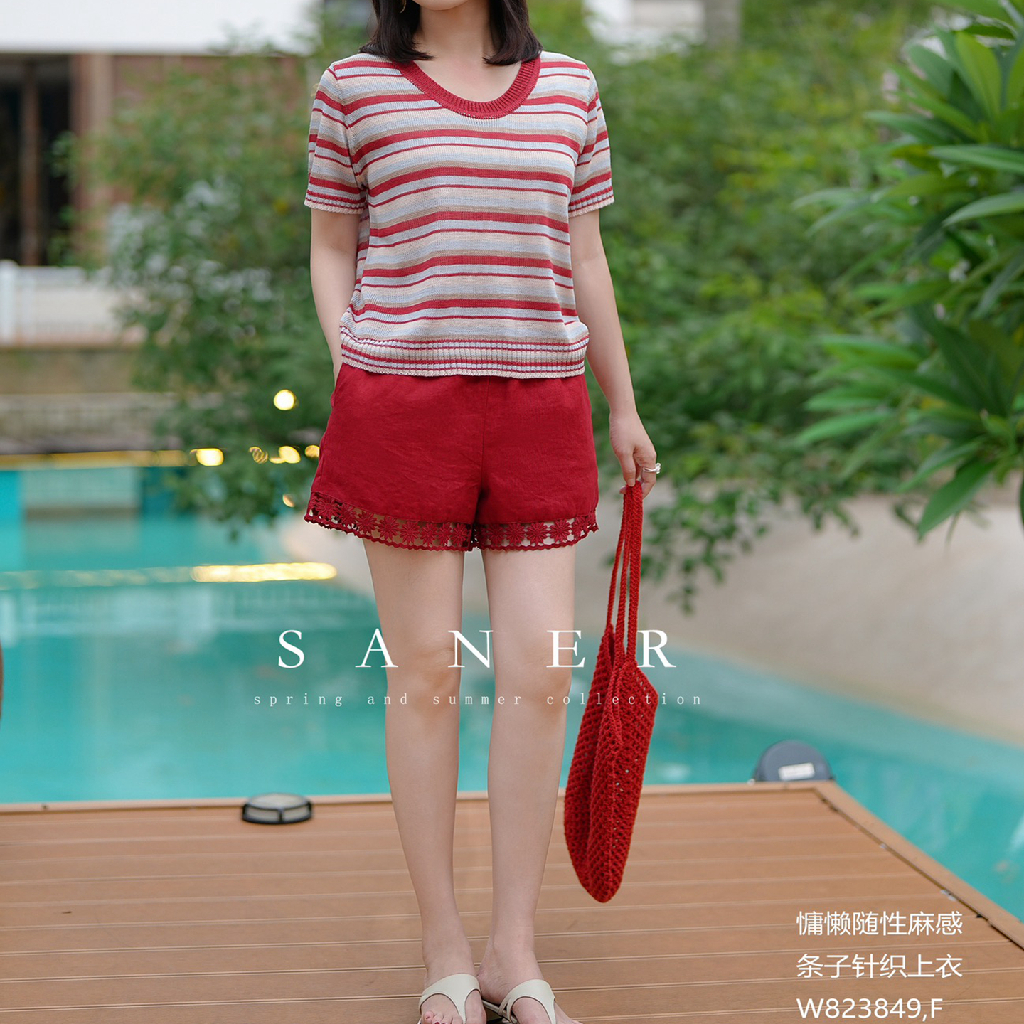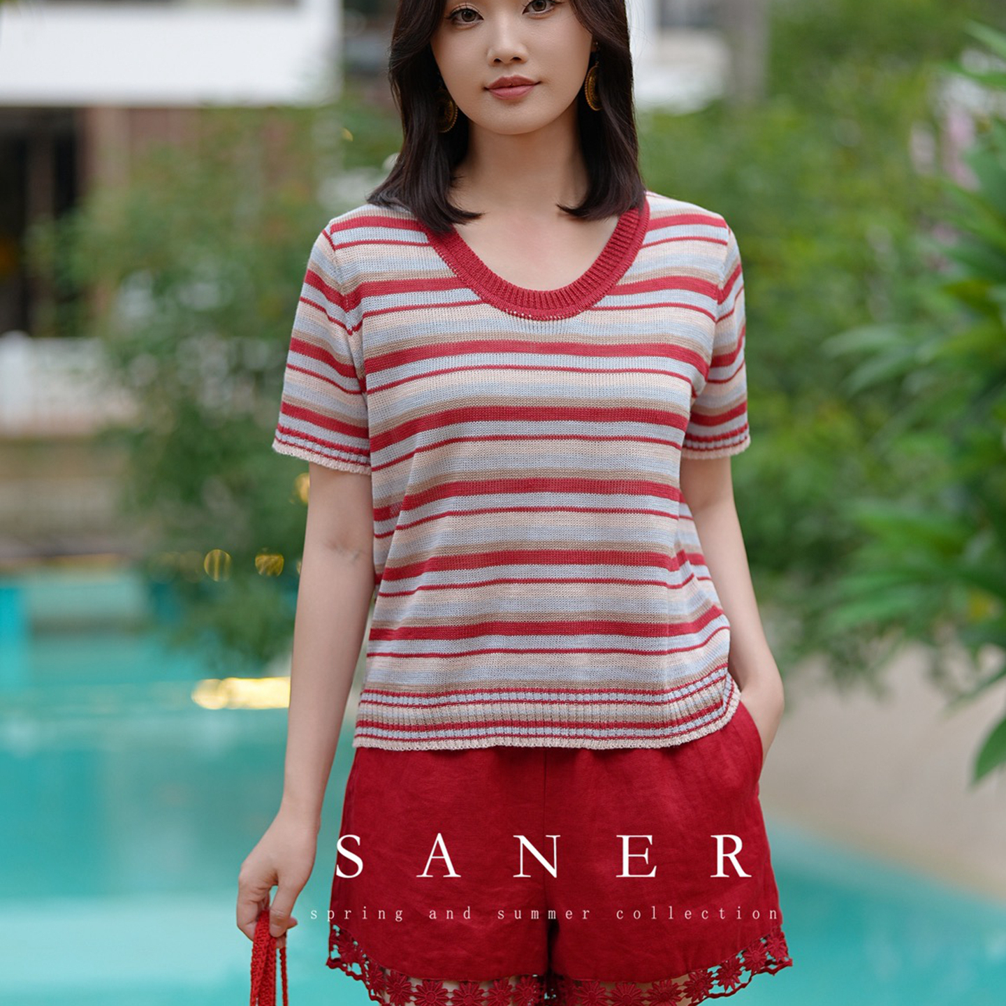 特价SANER2025夏季新品823849宽松U领撞色条纹针织衫短袖短款上衣