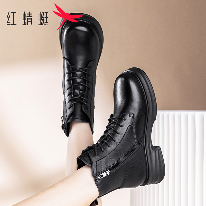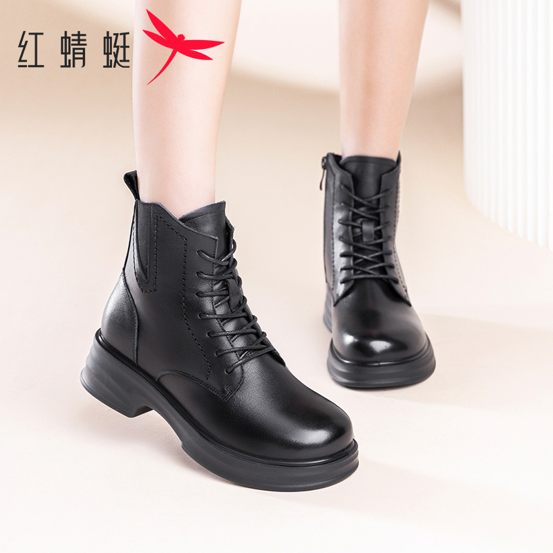 红蜻蜓女鞋2025秋冬新款休闲舒适短靴厚底系带加绒英伦风马丁靴
