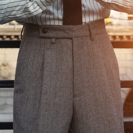 英伦复古羊毛粗花呢人字纹高腰长裤咖啡色微厚款雅痞结婚修身西裤