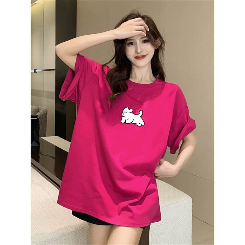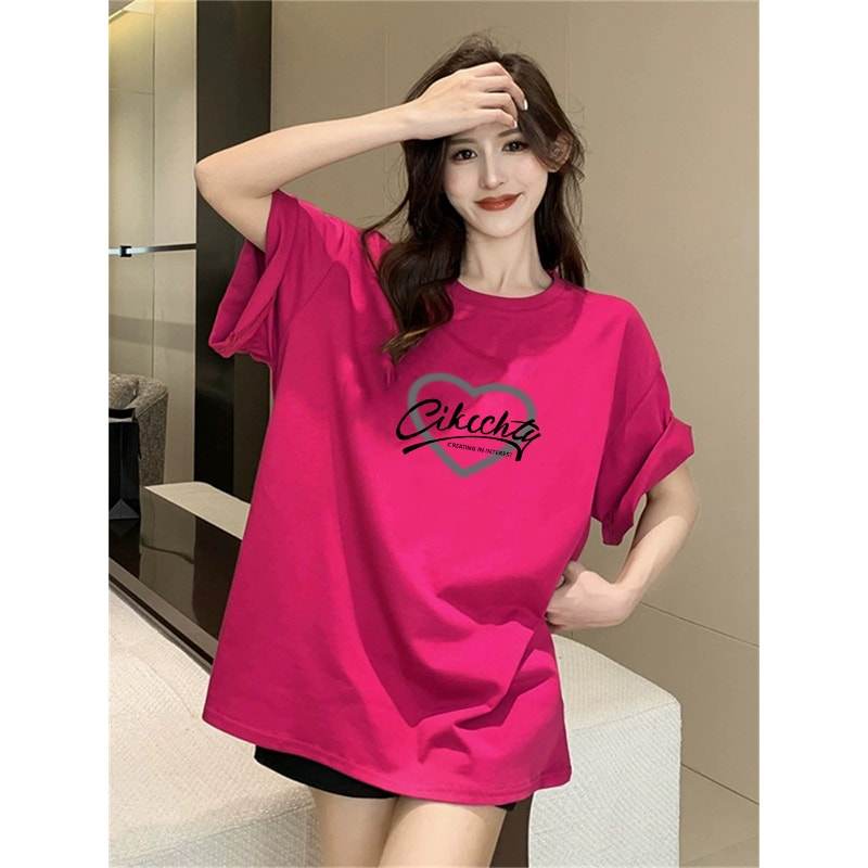 宽松中长百搭短袖纯棉玫红色T恤