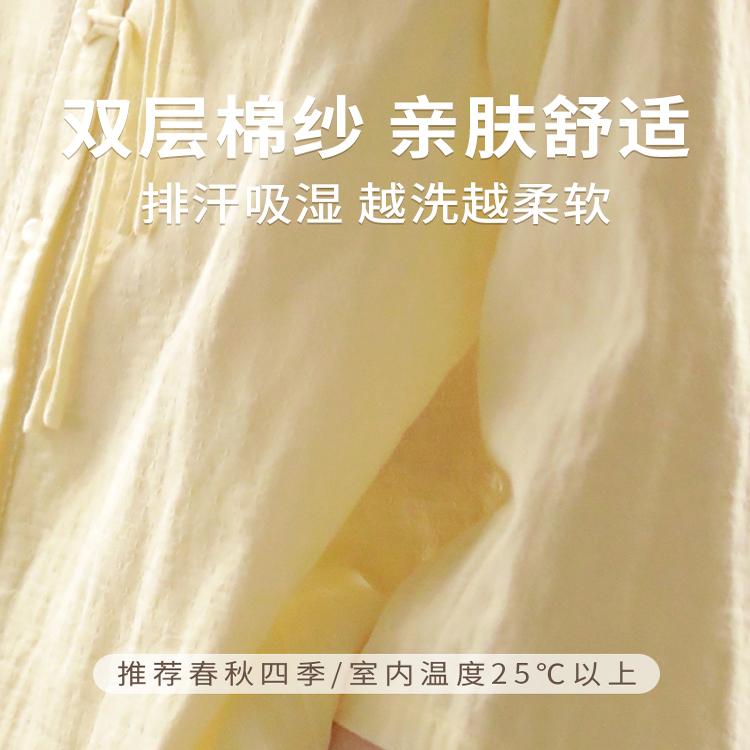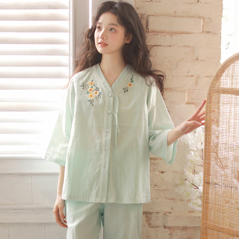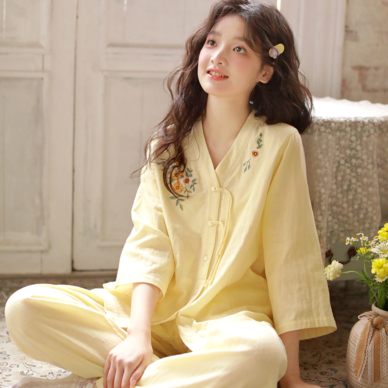 春夏季棉纱睡衣女柔软透气高级感刺绣V领七分袖长裤家居服套装