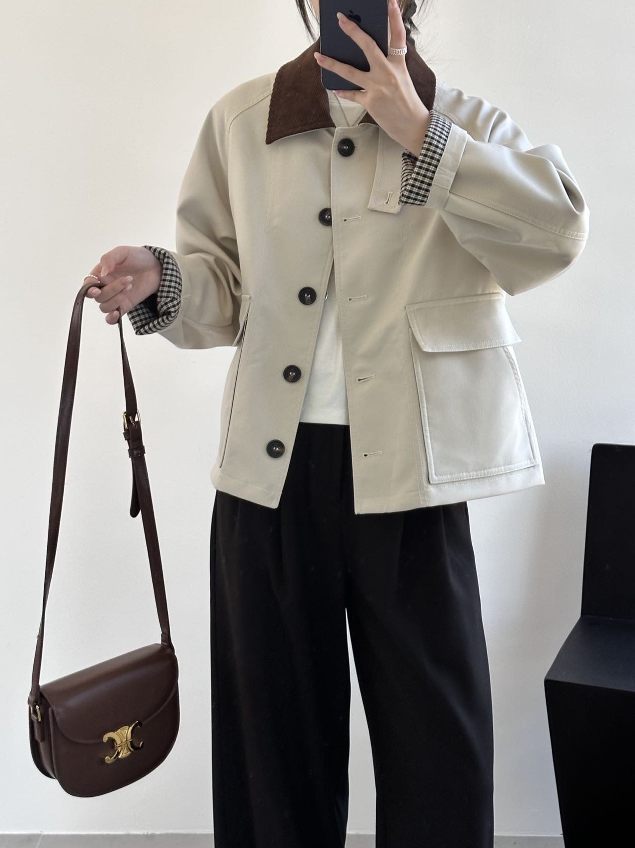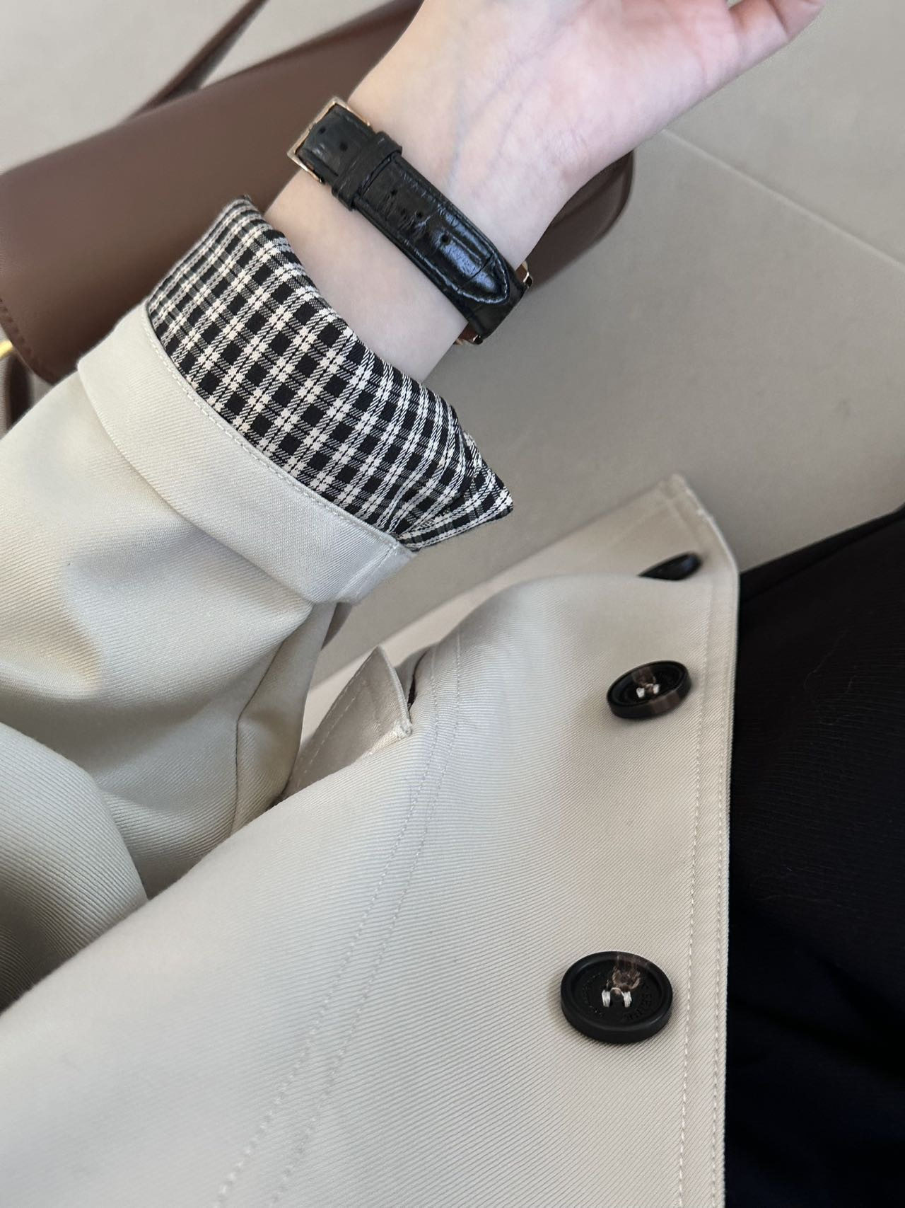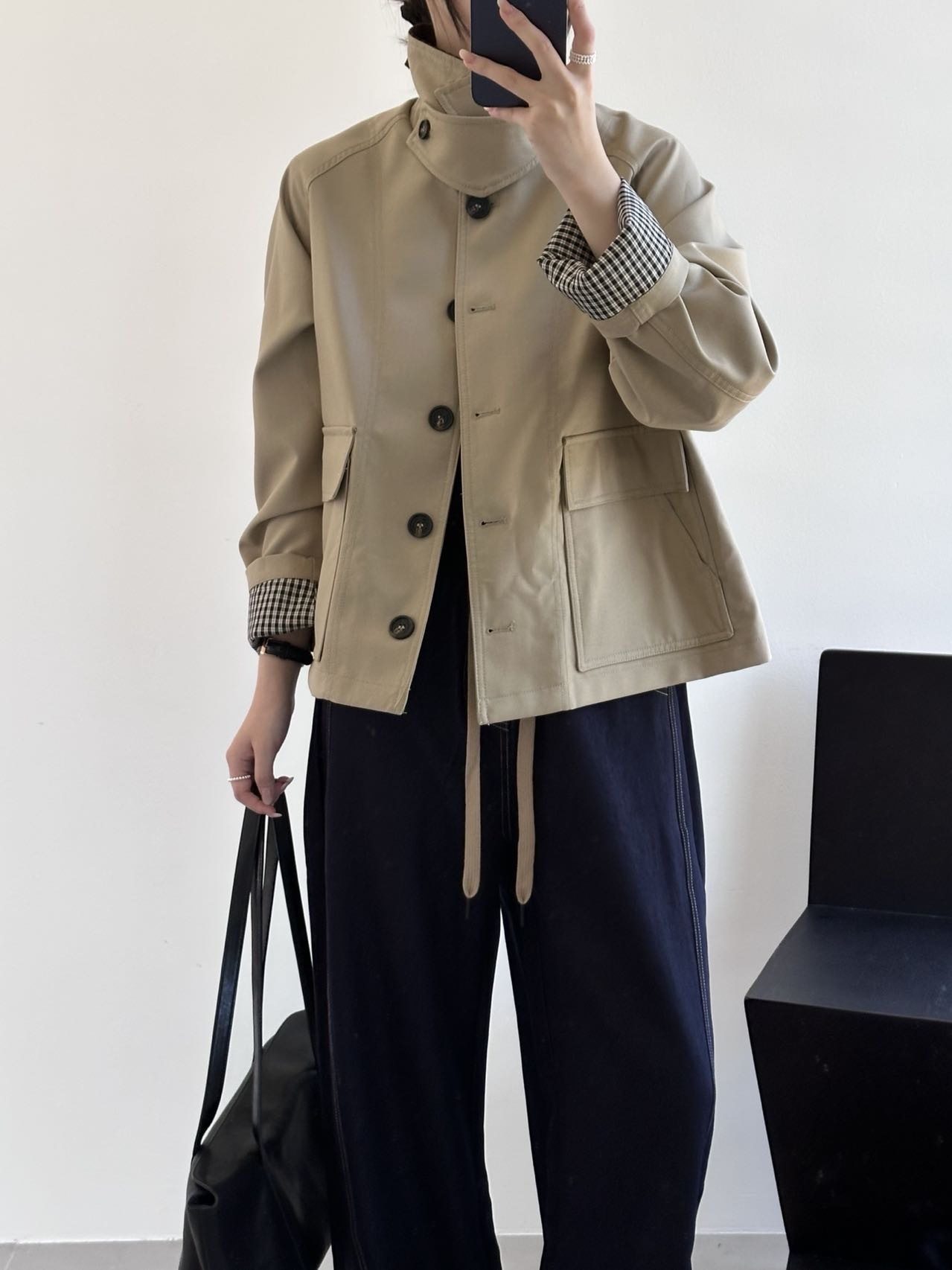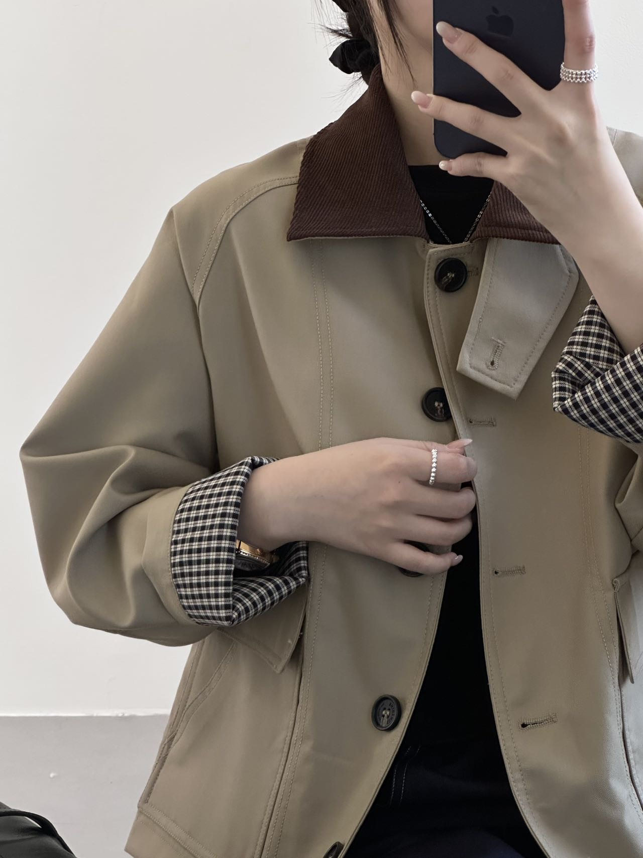 2025春秋新款巴恩风翻领短款风衣拼接格子短外套女休闲百搭潮5492