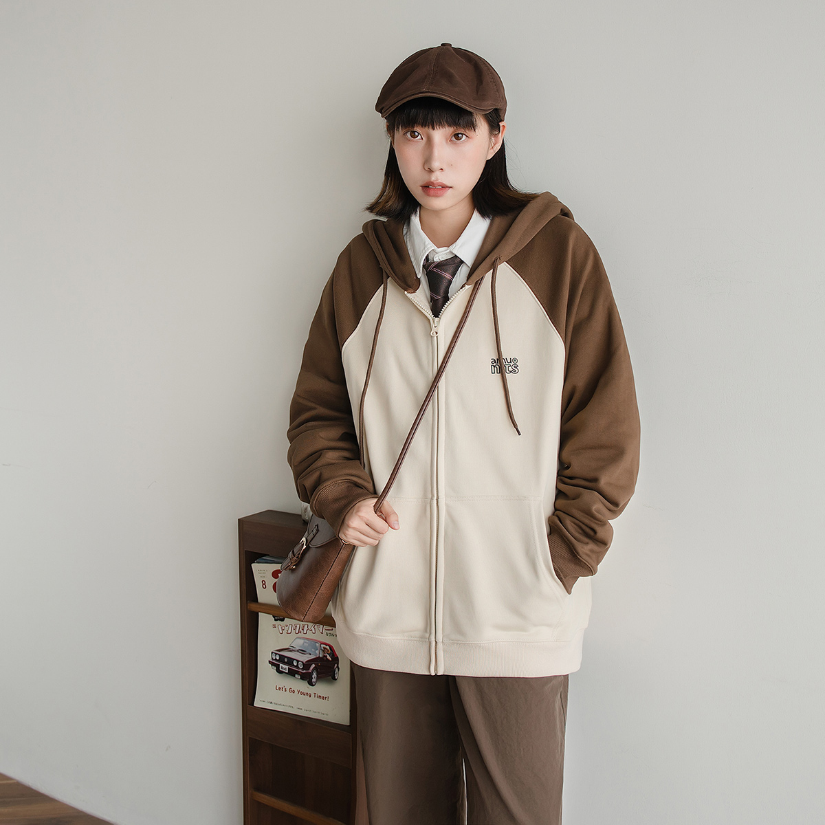 春季休闲拼接撞色连帽开衫卫衣日系男女款字母印花插肩袖外套