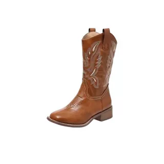 牛皮版西部牛仔靴女长靴2025新款刺绣骑士靴方头厚底粗跟中筒靴子