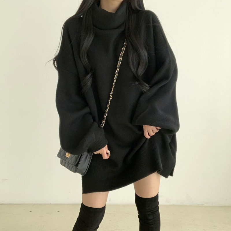 日系慵懒风黑色高领针织衫毛衣女学生秋冬宽松显瘦中长款开叉