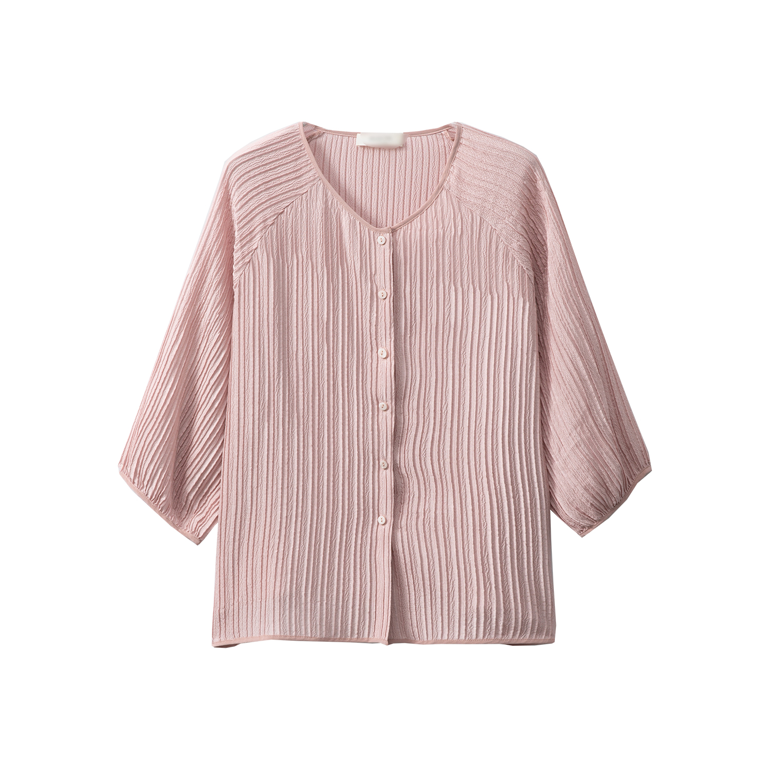 一丝牵 肌理皱感文艺感真丝插肩袖圆领衬衫开衫灯笼袖七分袖上衣