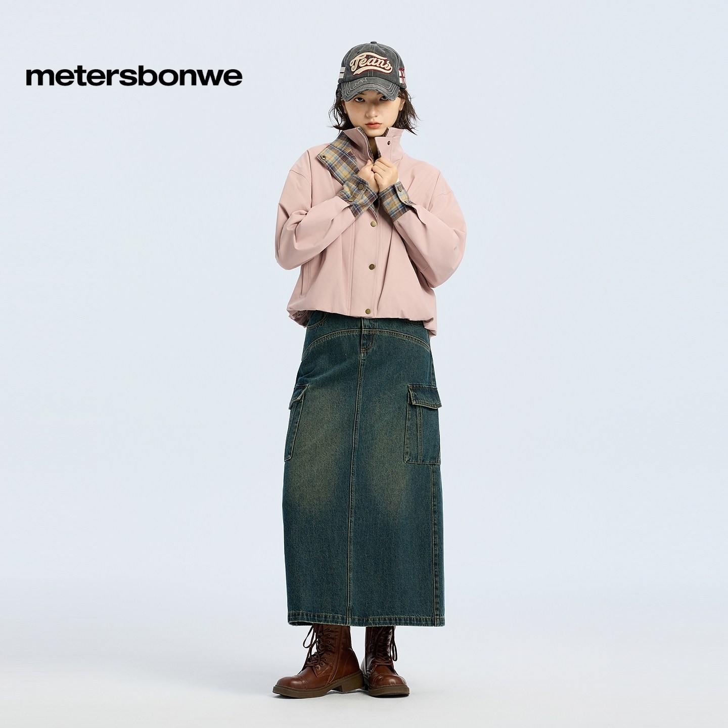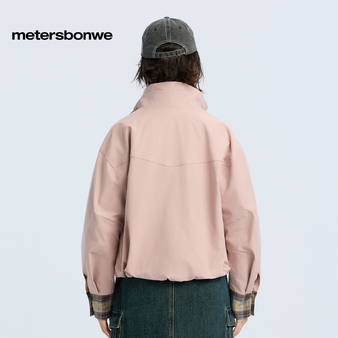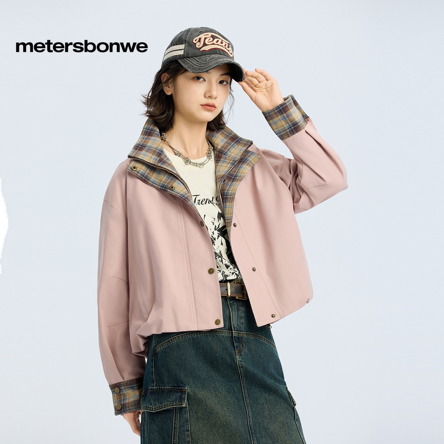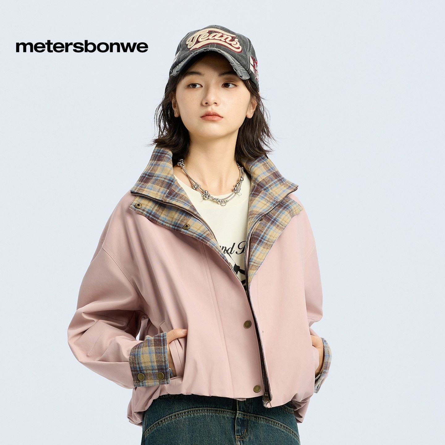 美特斯邦威短夹克女2025秋冬新款潮流假两件格纹派克茄克短款外套