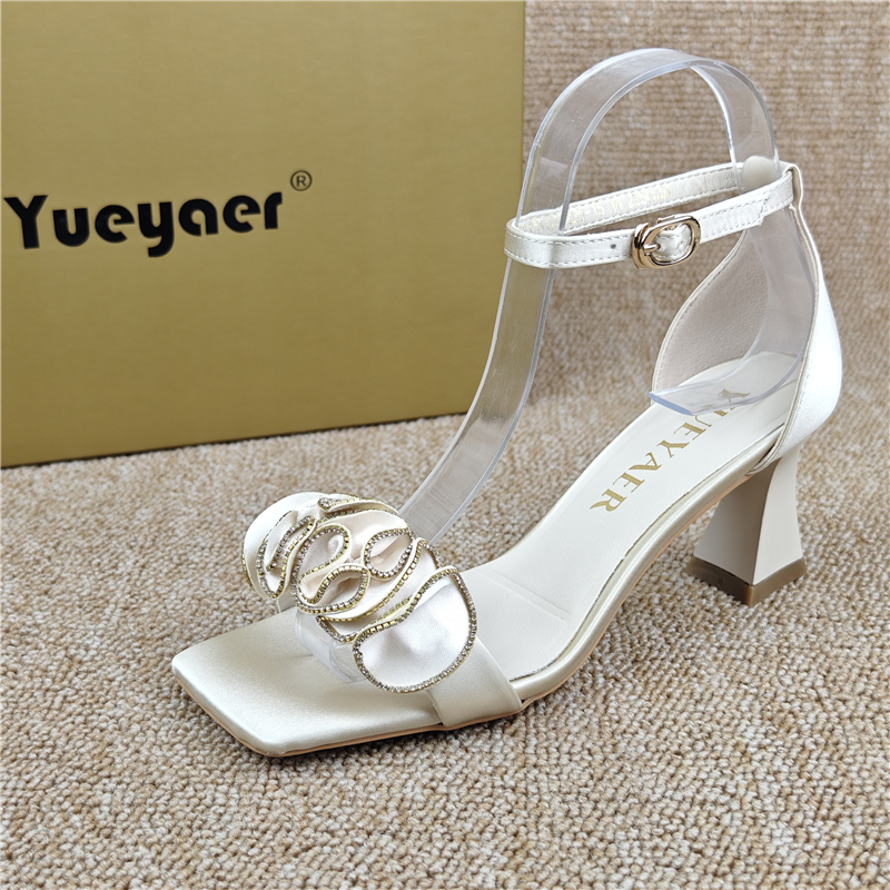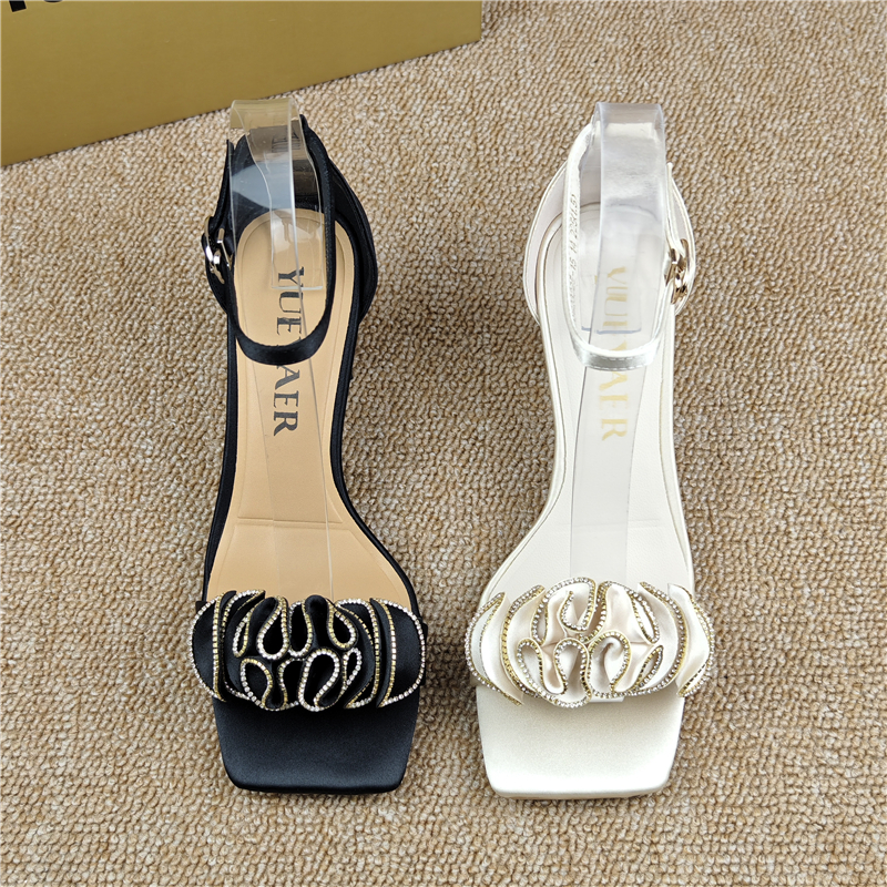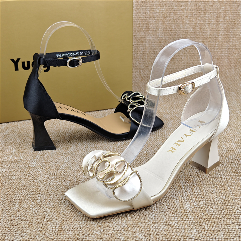 月芽儿品牌撤柜2025新款时尚百搭粗跟花朵水钻凉鞋法式高跟鞋女鞋