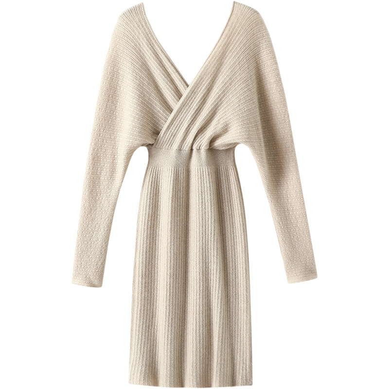 华贵典雅大气!秋冬双V领羊绒衫女长款100%纯山羊绒毛衣连衣裙子