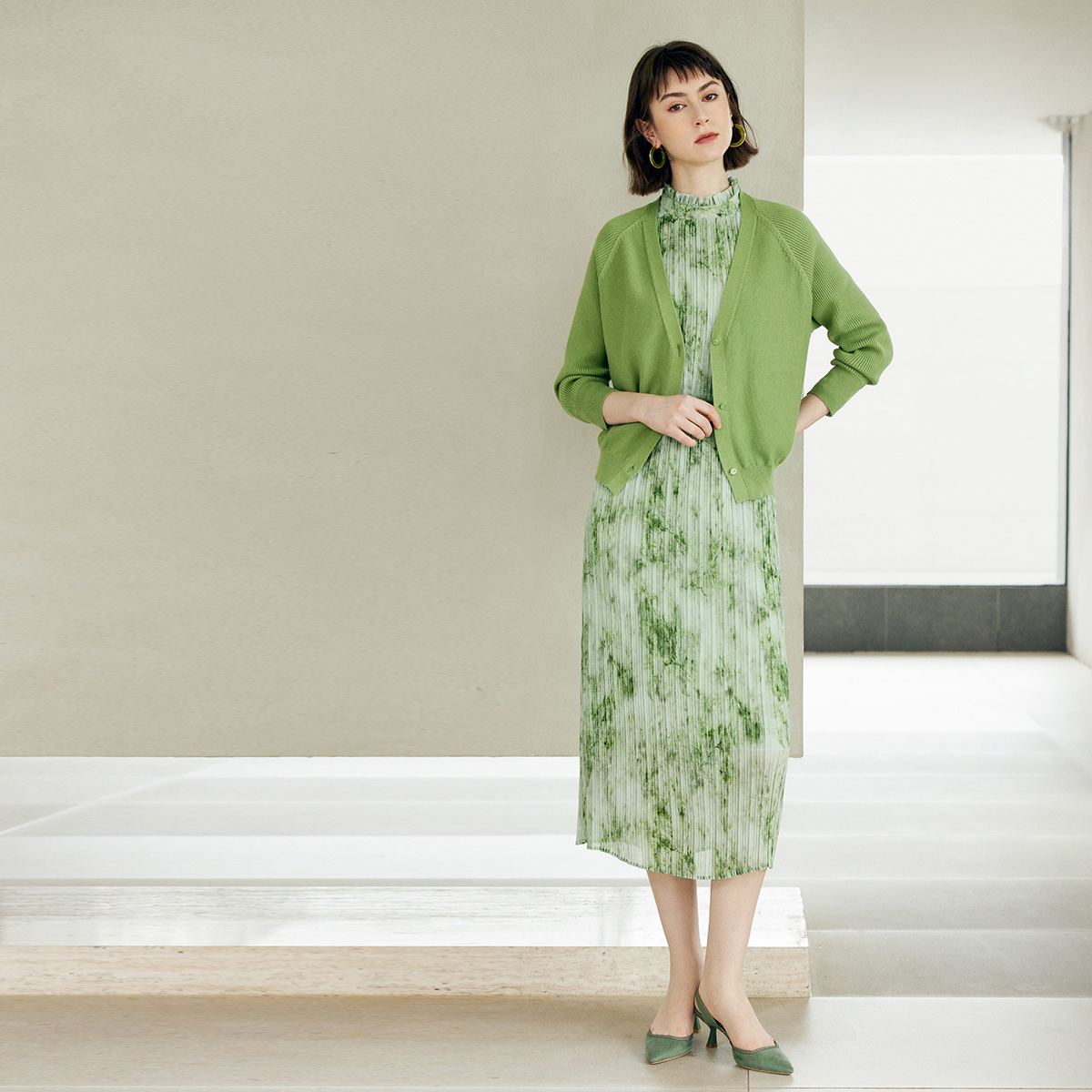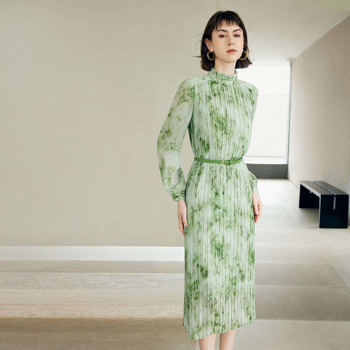 颜域重工压褶晕染连衣裙女士秋季2025新款长袖立领中长款百褶裙子