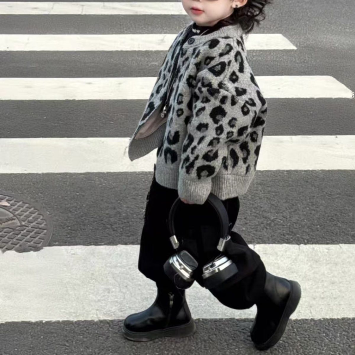 男童豹纹韩版毛衣开衫2025深秋冬新款儿童洋气针织衫外套三件套潮