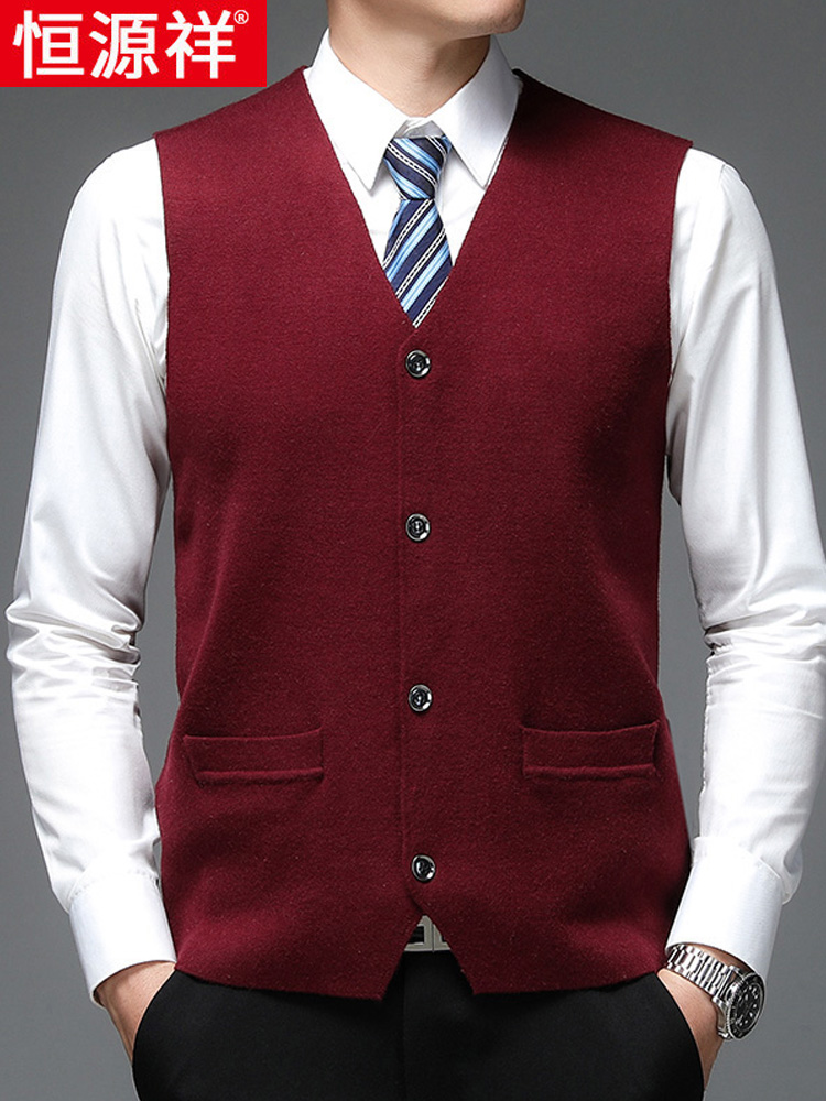 恒源祥秋冬加厚羊绒背心男士休闲外穿有口袋开衫中年爸爸羊毛马甲