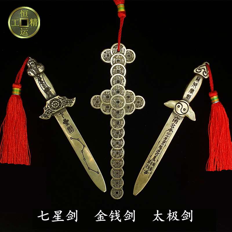 仿古纯铜五帝金钱剑挂件铜钱剑七星剑手工编织铜钱工艺品拍摄道具