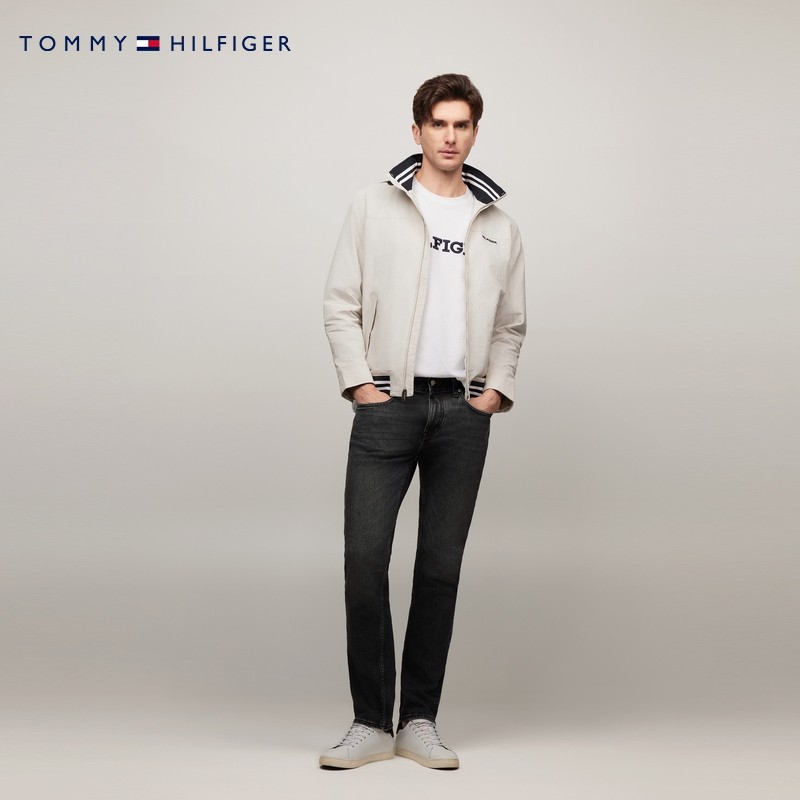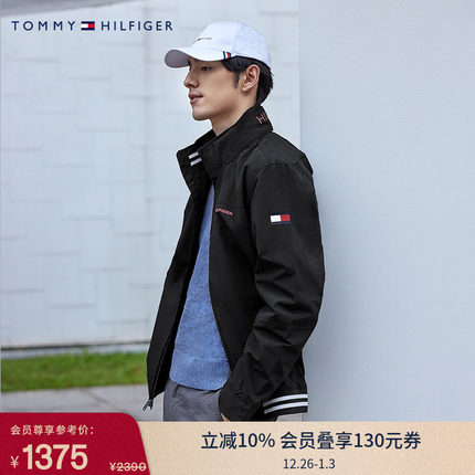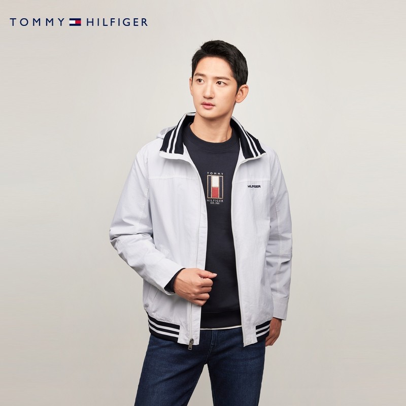 Tommy秋冬男装户外拼色条纹轻便可收纳连帽立领底特律夹克外套