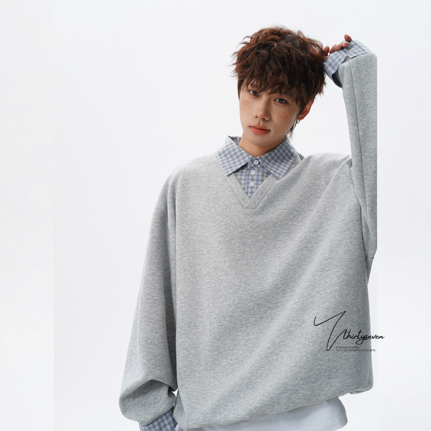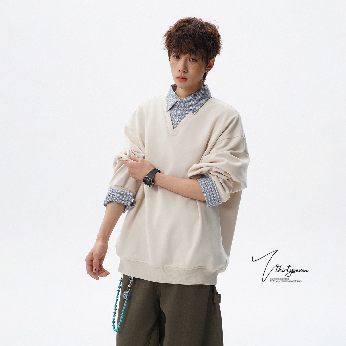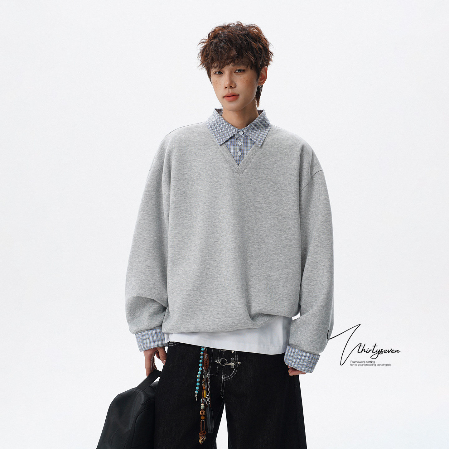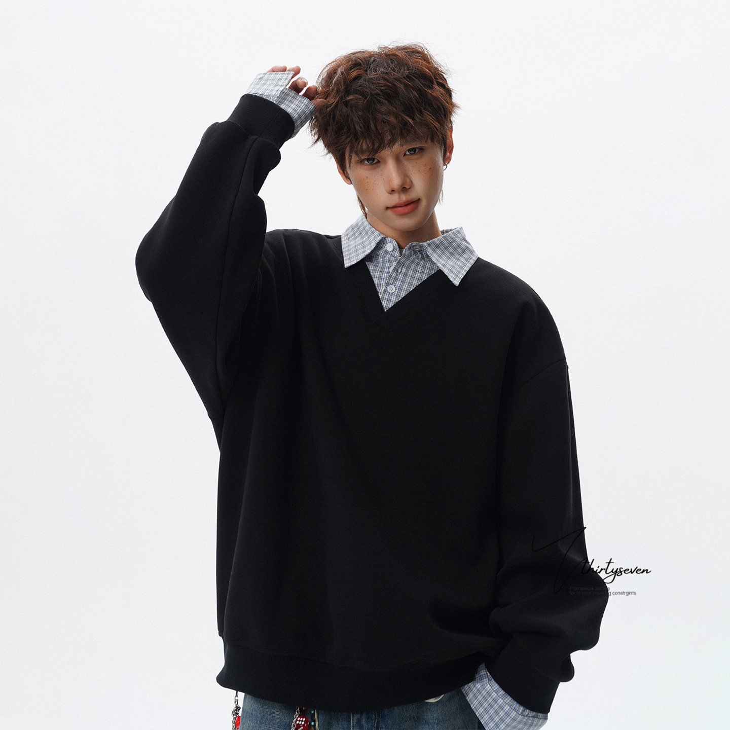 V37美式潮牌高街假两件衬衫领卫衣男春黑色宽松格纹拼接套头上衣