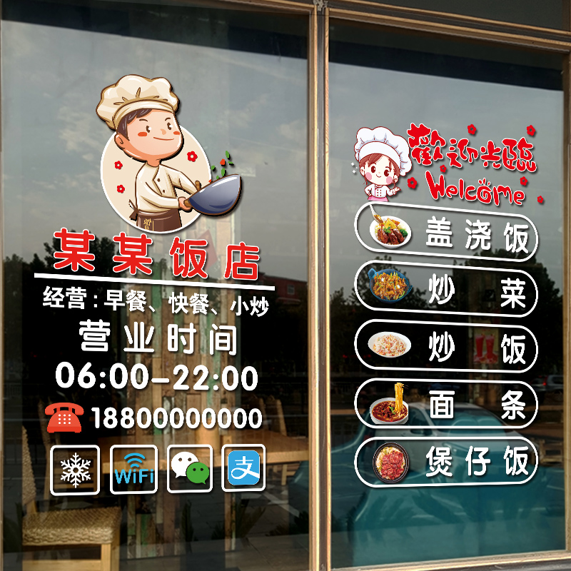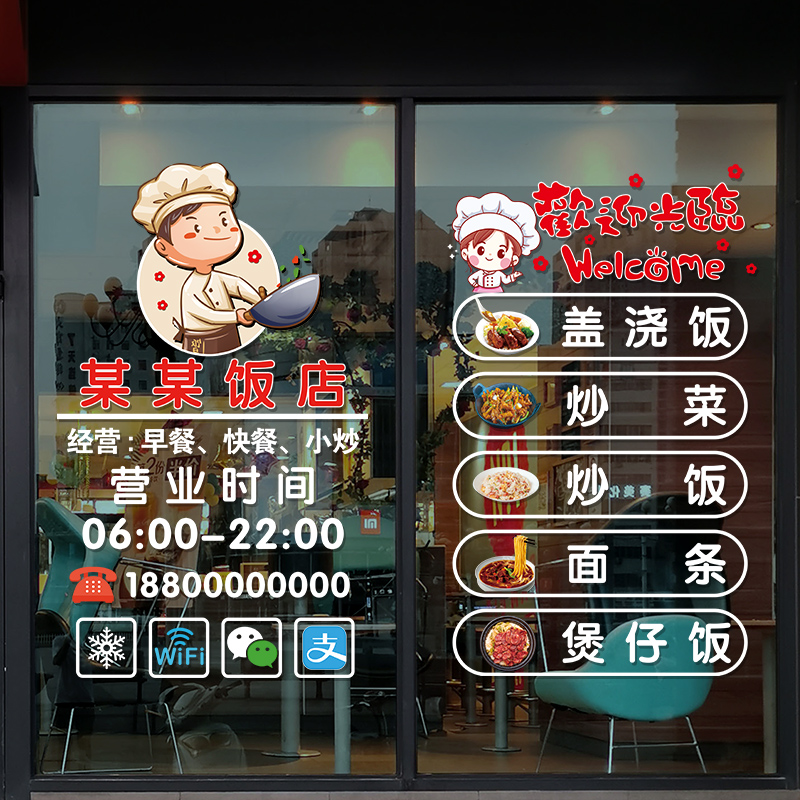 早餐饭店玻璃门贴纸n创意餐厅炒菜小吃店橱窗装饰营业时间广告贴