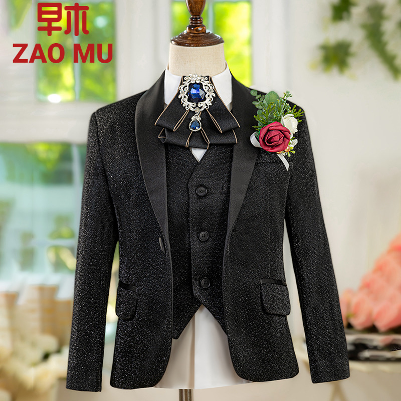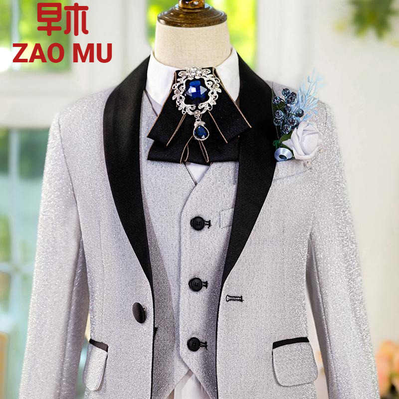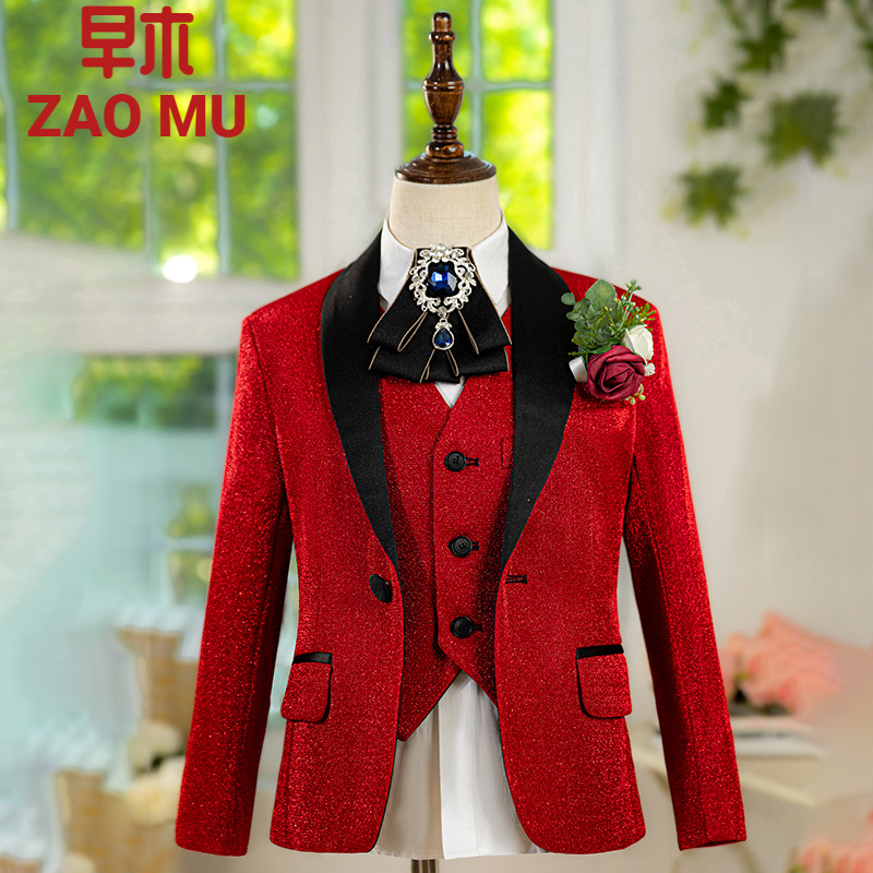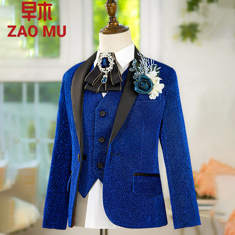 儿童金色亮片西装套装男童小主持人西服模特走秀宝石蓝亮丝礼服