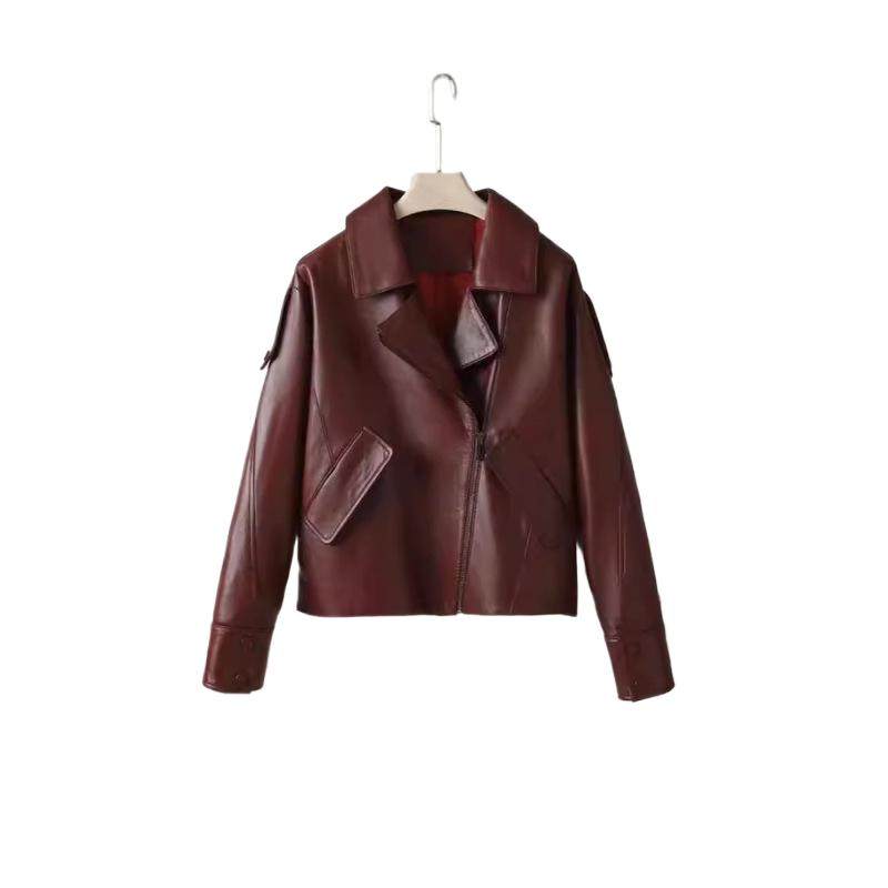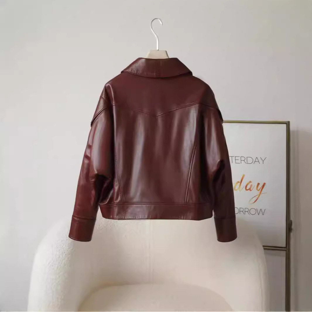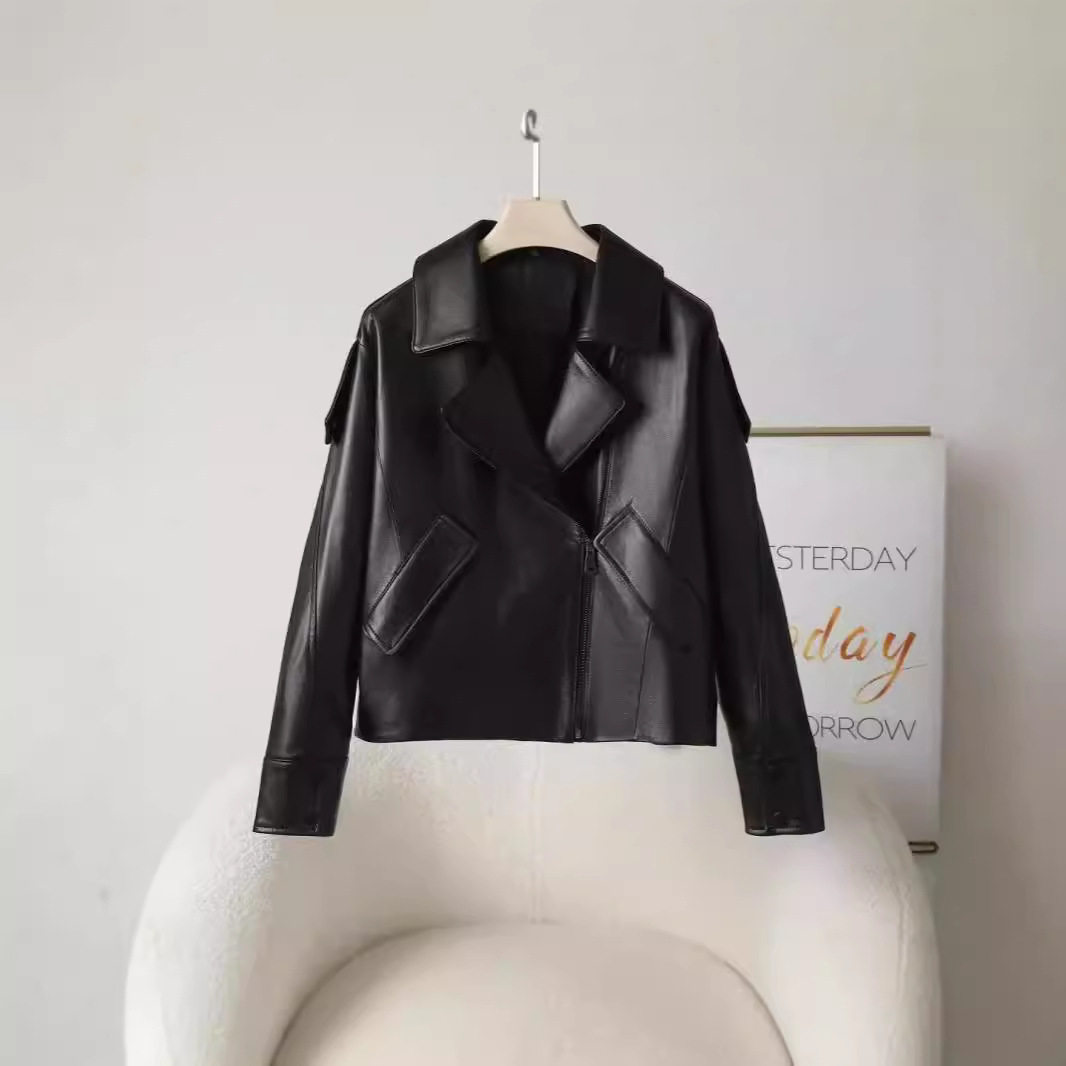 2024新款海宁真皮春季短款宽松机车绵羊水蜡半植鞣皮衣女装夹克外