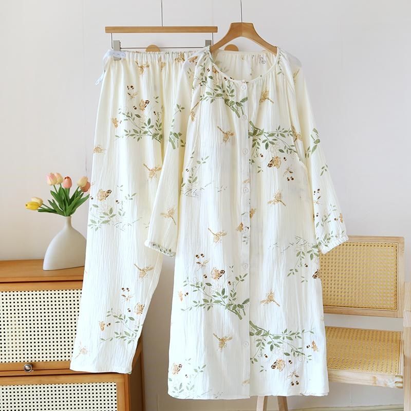 月子服待产裙两件套夏季薄款孕妇睡裙双层纯棉纱布长袖哺乳睡衣