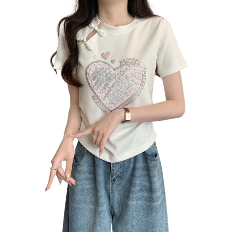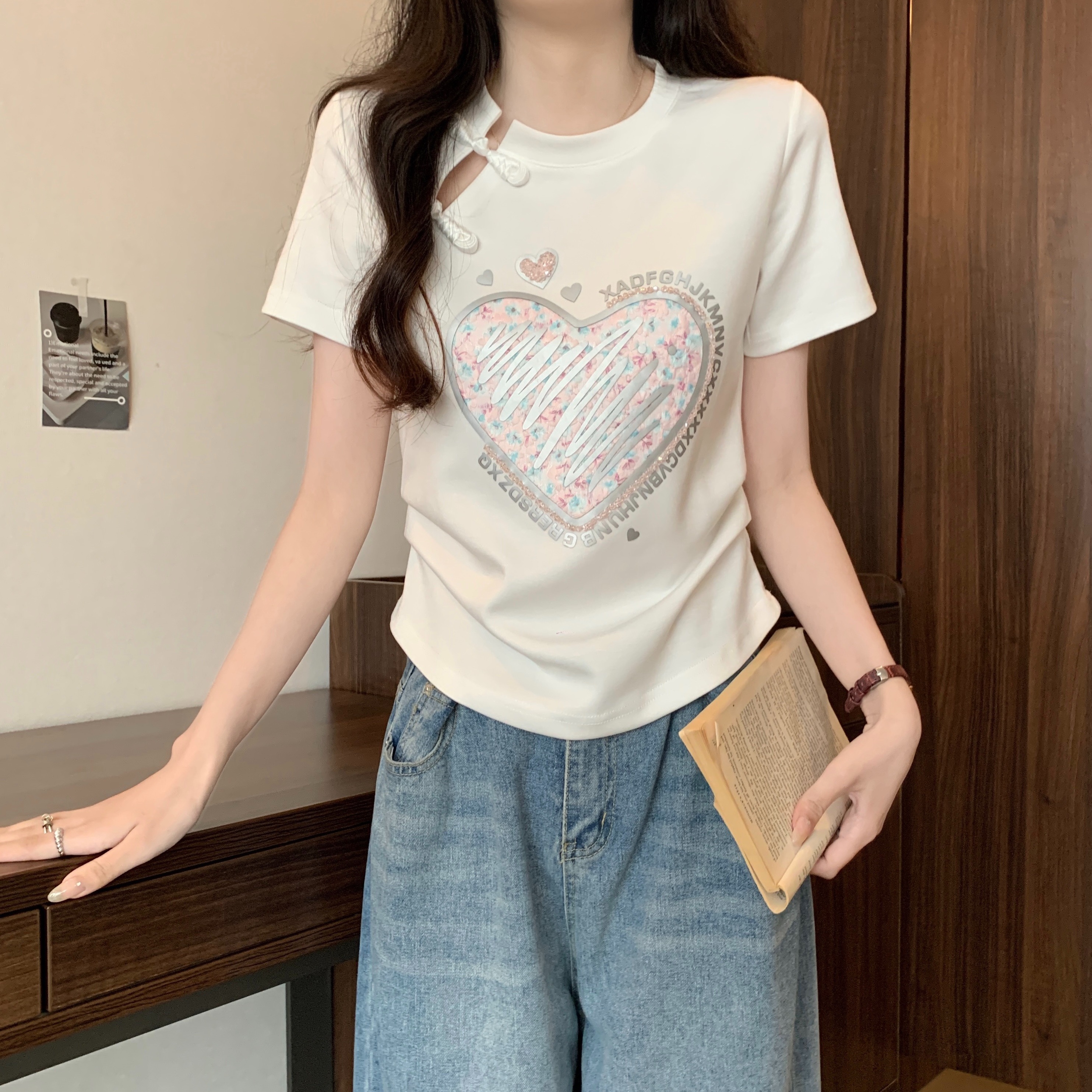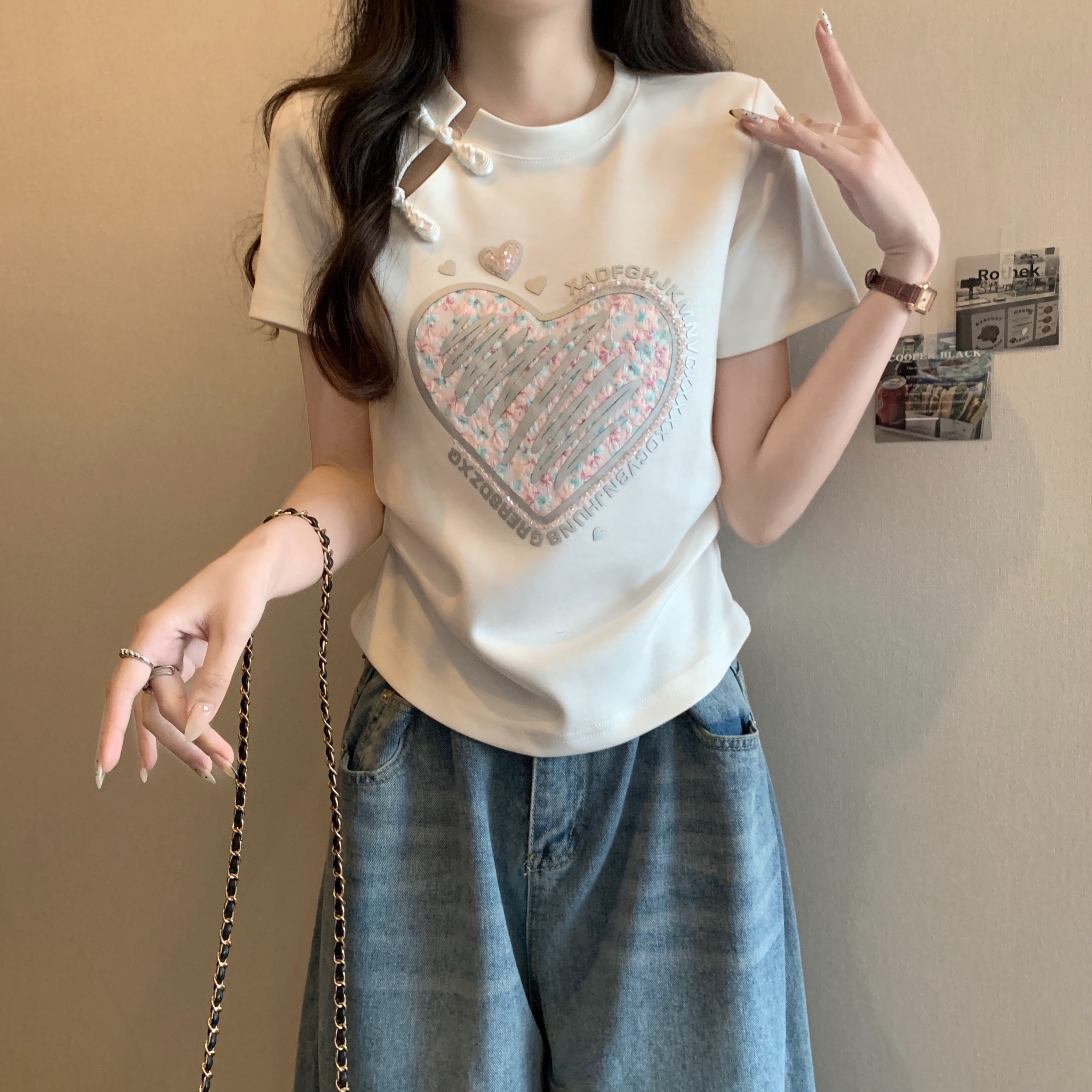 大码女装夏季新款中式国风爱心烫钻短袖t恤胖mm遮肚显瘦半袖上衣