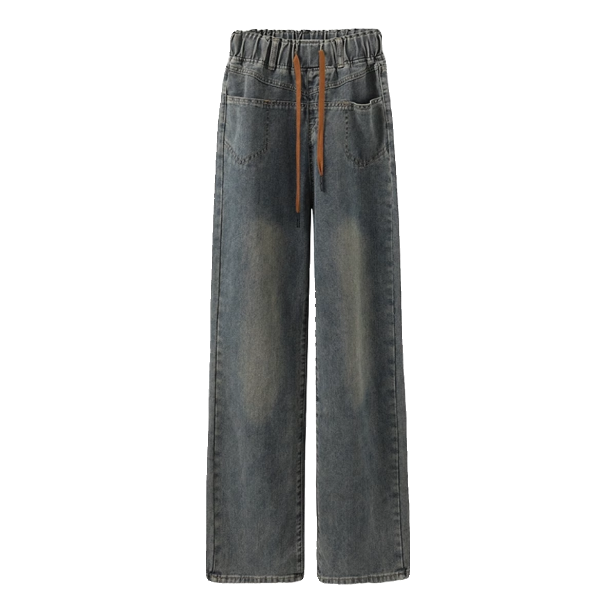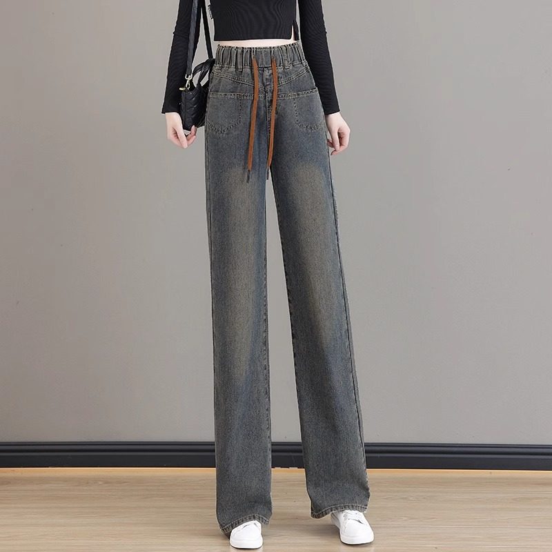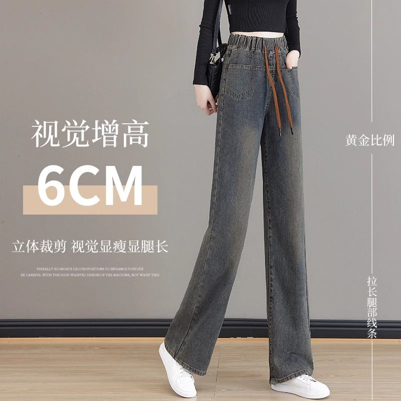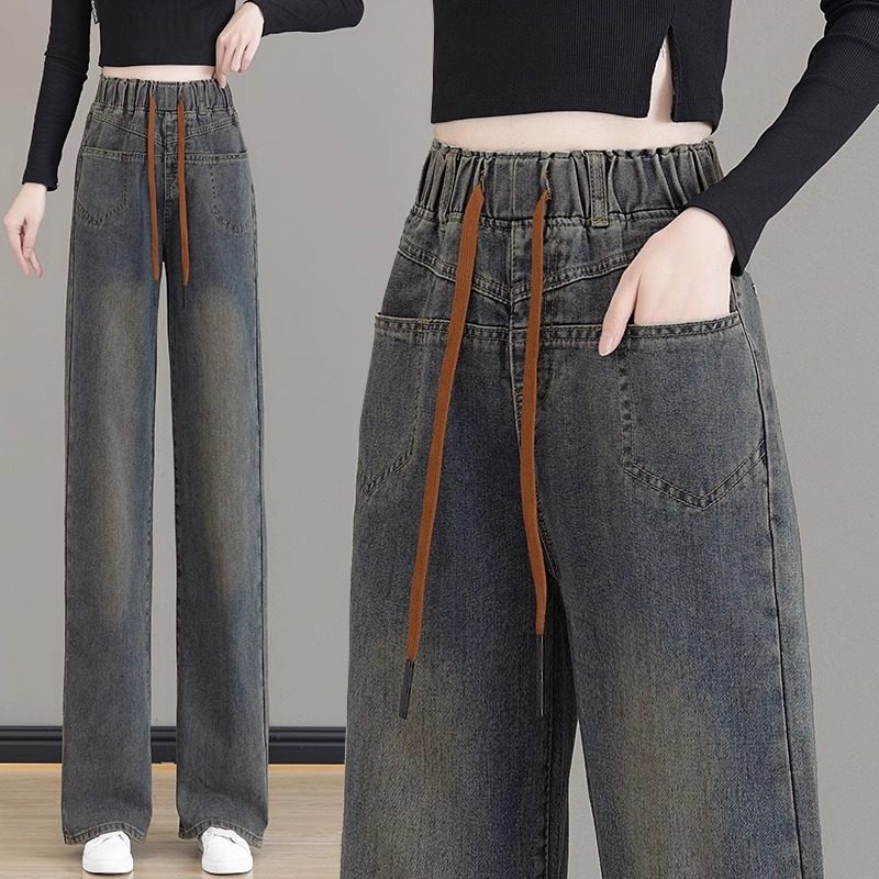 水泥灰阔腿牛仔裤女高腰加绒2025新款松紧腰大码直筒拖地阔腿裤子