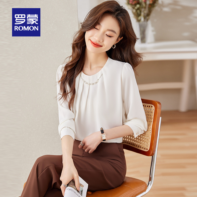 罗蒙女士休闲百搭圆领长袖衬衫2025秋季新款气质优雅职业通勤衬衣