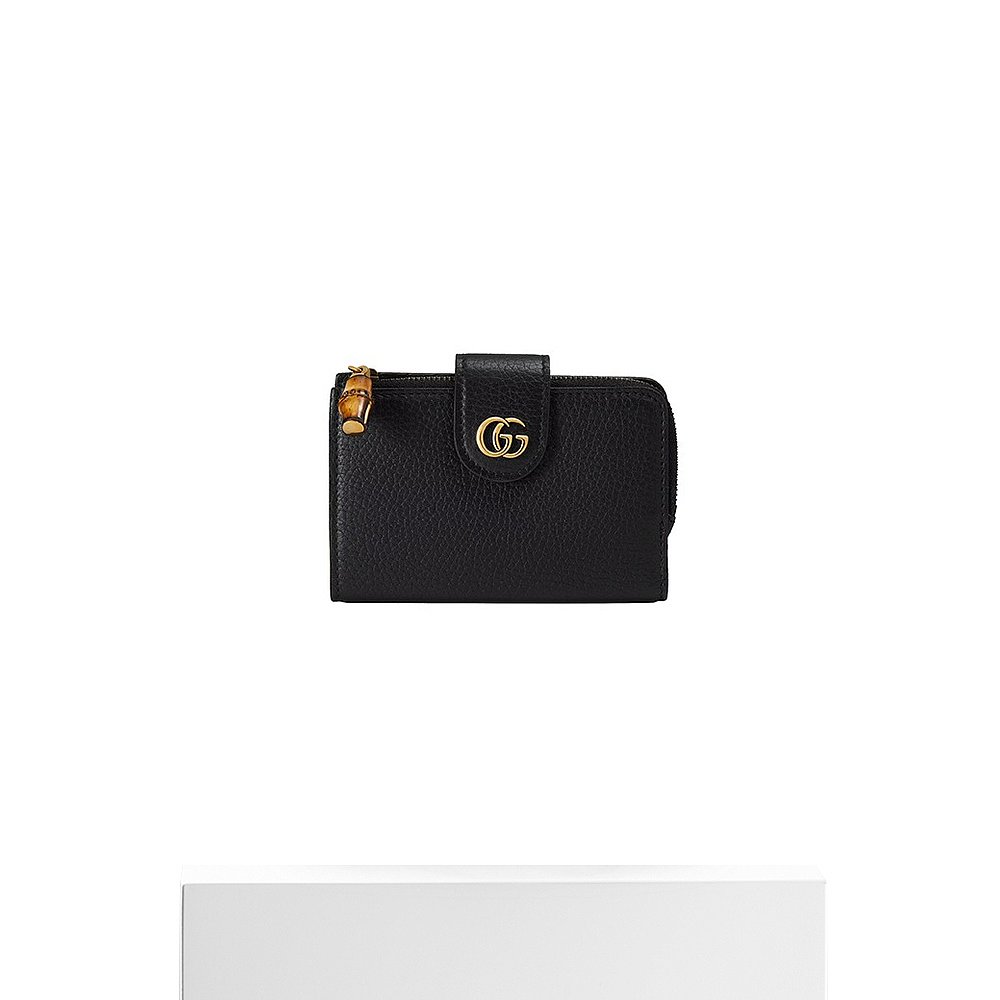 自营GUCCI/古驰 23新款 女士中号黑色皮革双G配饰竹制拉链钱包