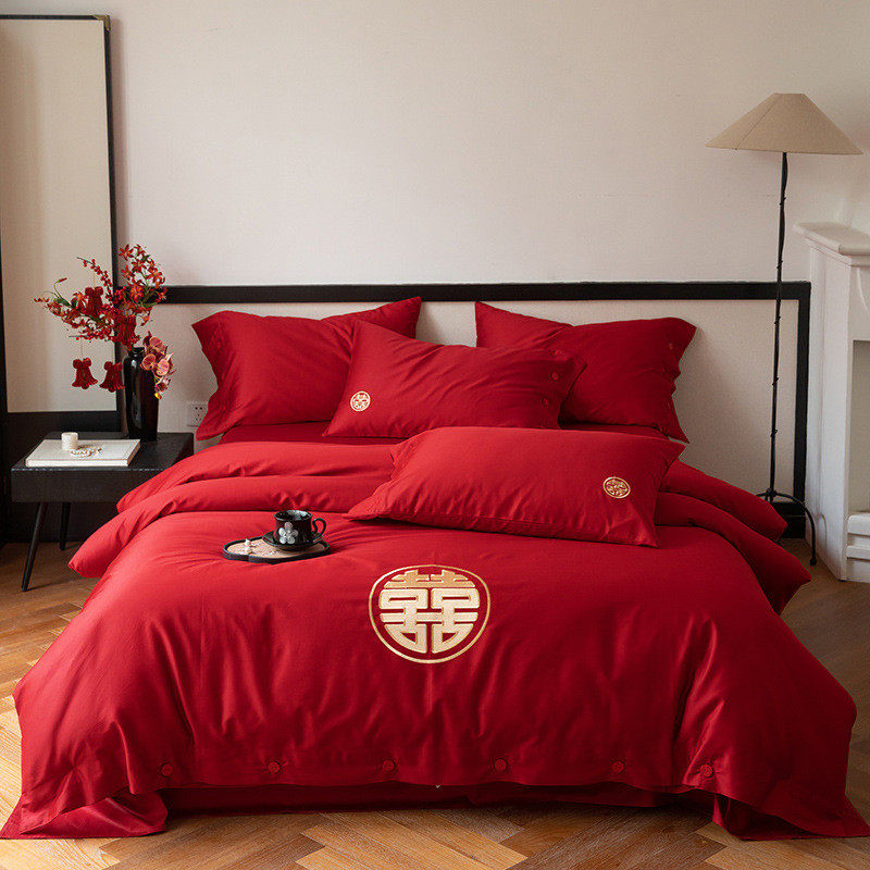 新中式婚庆100S长绒棉结婚四件套红色喜庆床单被套新婚家用简约款