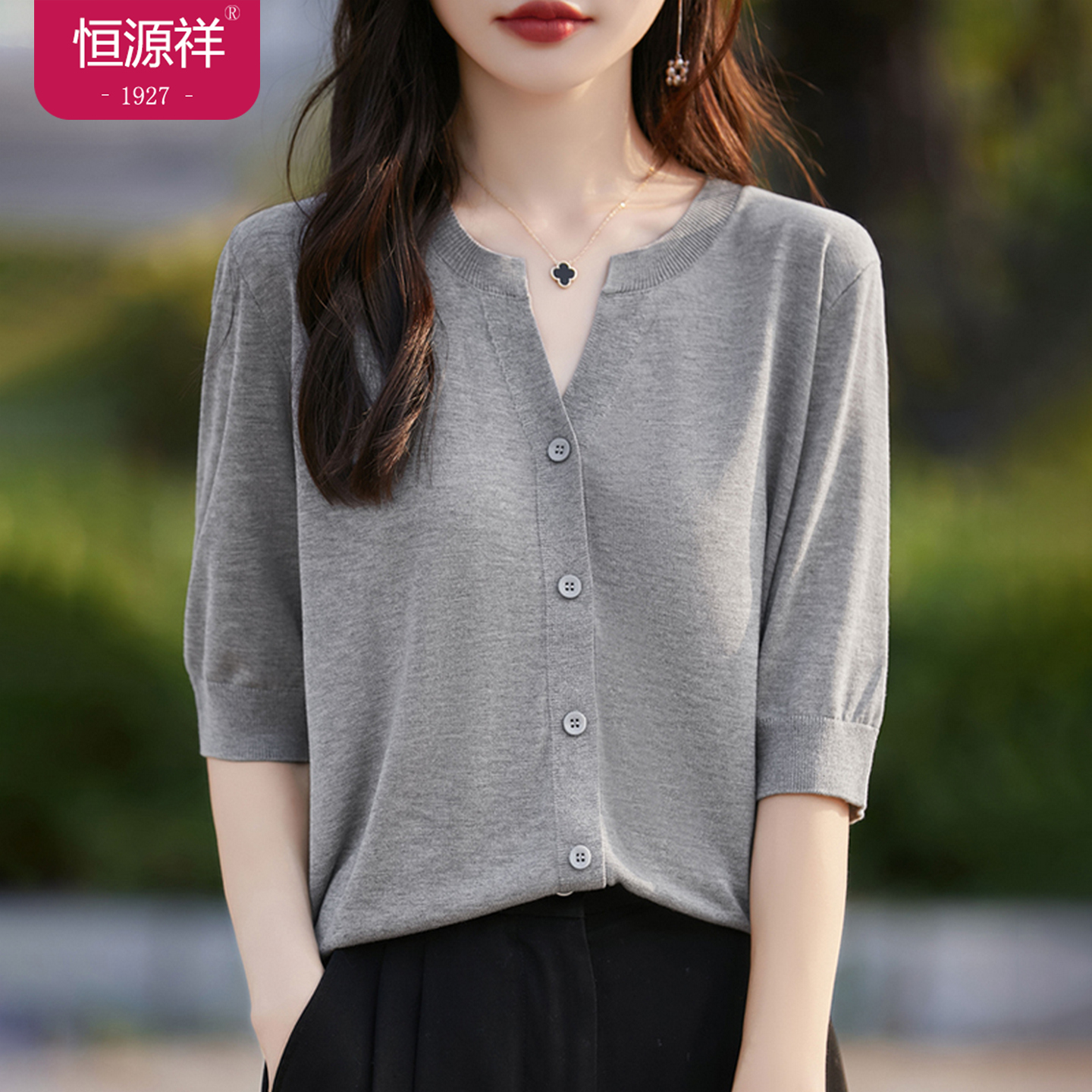 恒源祥桑蚕丝v领针织衫女夏五分袖天丝上衣宽松短款中袖冰丝开衫