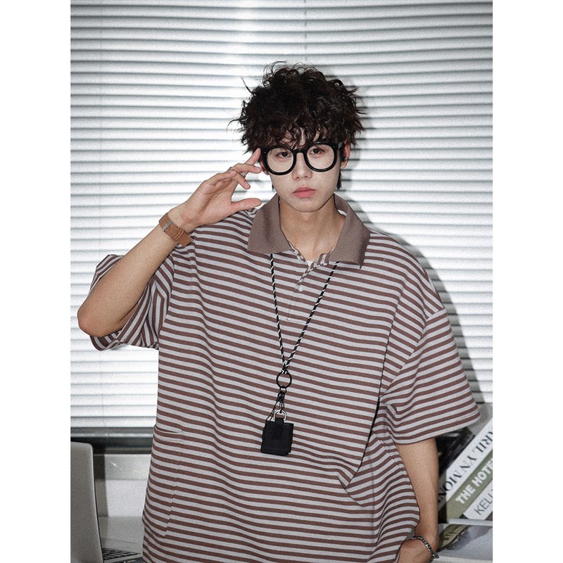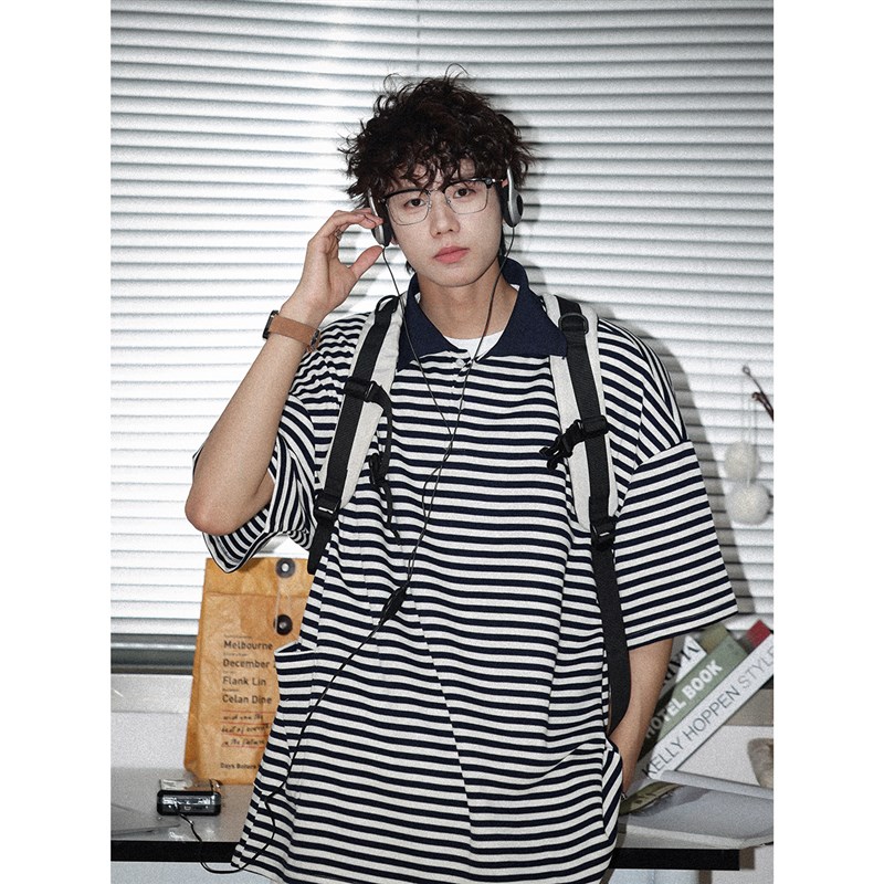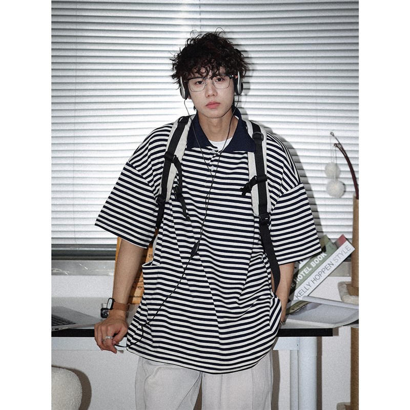 夏季新款条纹POLO衫短袖t恤男生潮流日系复古情侣宽松半袖上衣tee