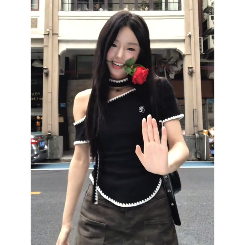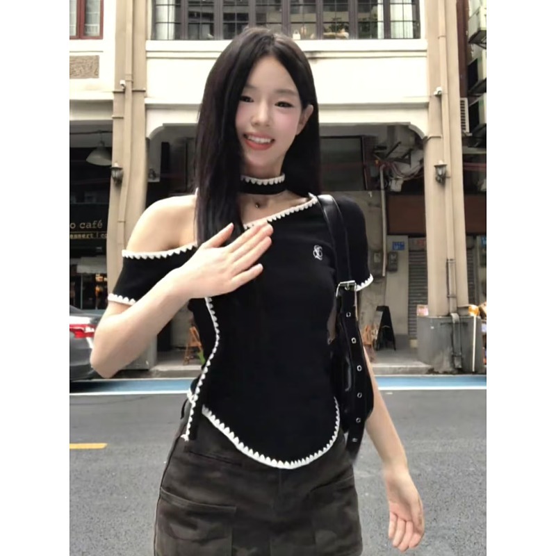 大码高级感斜肩短袖t恤女夏季胖mm设计感纯欲小众不规则绝美上衣