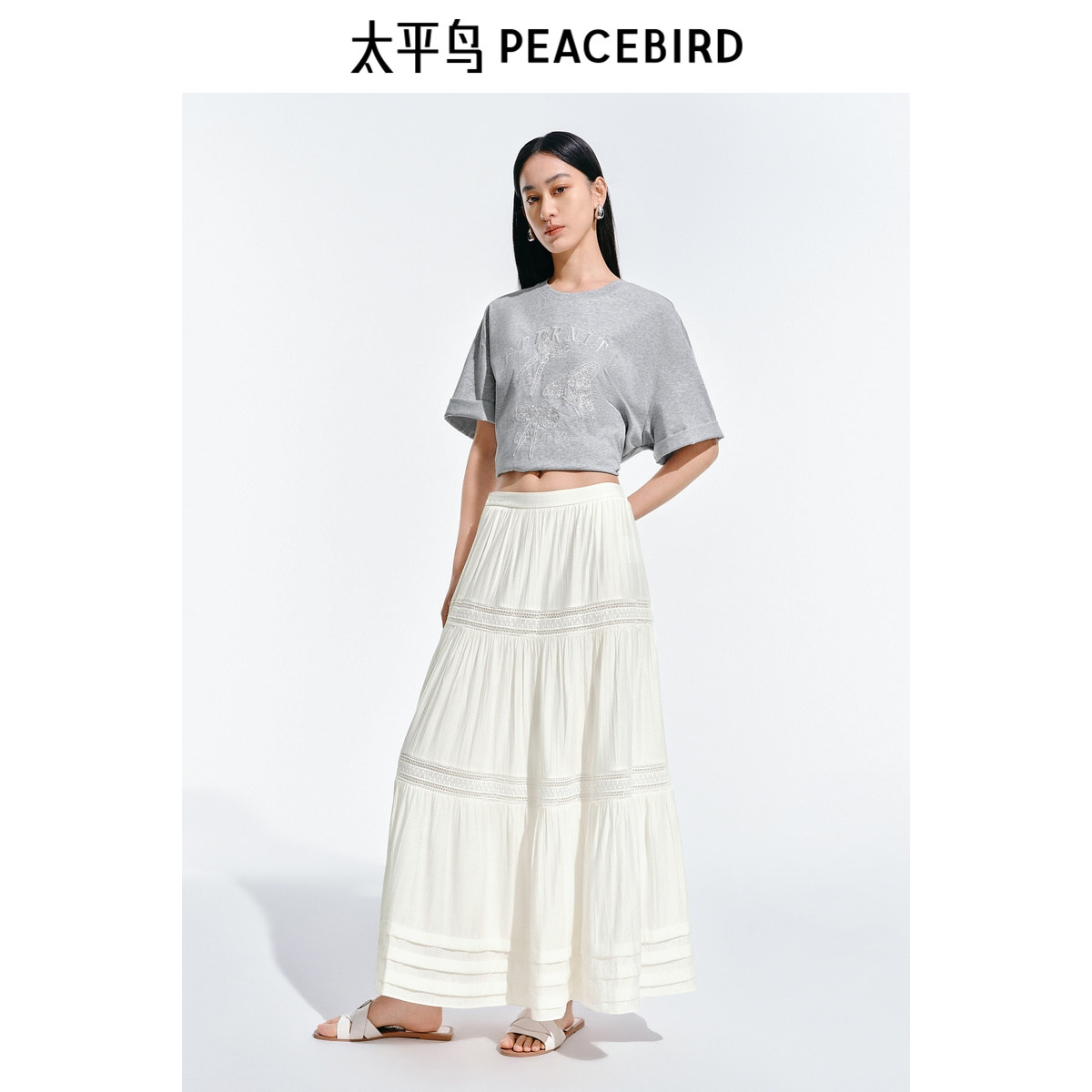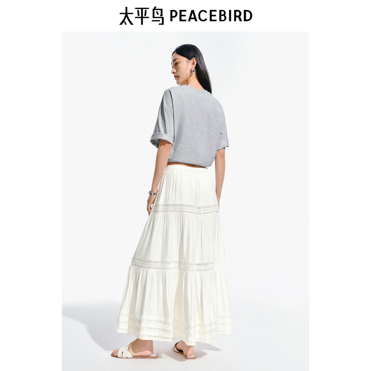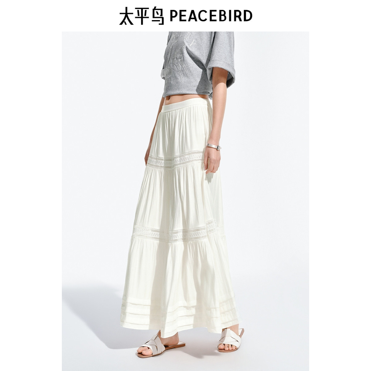 太平鸟蕾丝蛋糕半身裙女2025夏新款白色镂空长款度假风飘逸廓伞裙