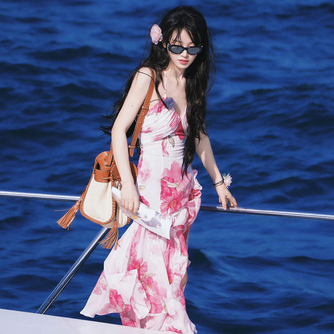 #Sisjuly#田曦薇同款清新甜美 碎花不规则荷叶边修身挂脖连衣裙女